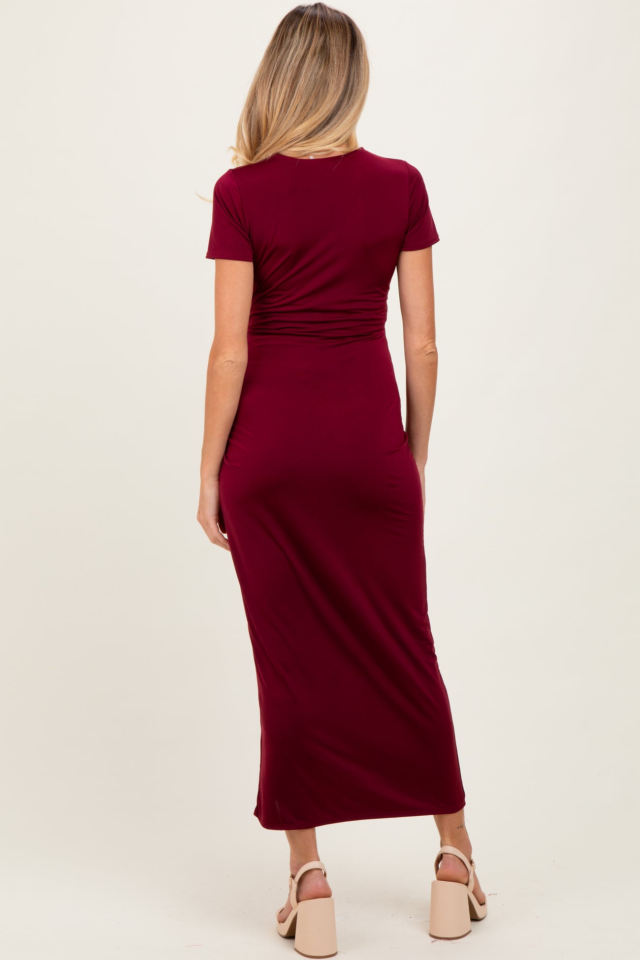 Burgundy Gathered Front Short Sleeve Maternity Maxi Dress