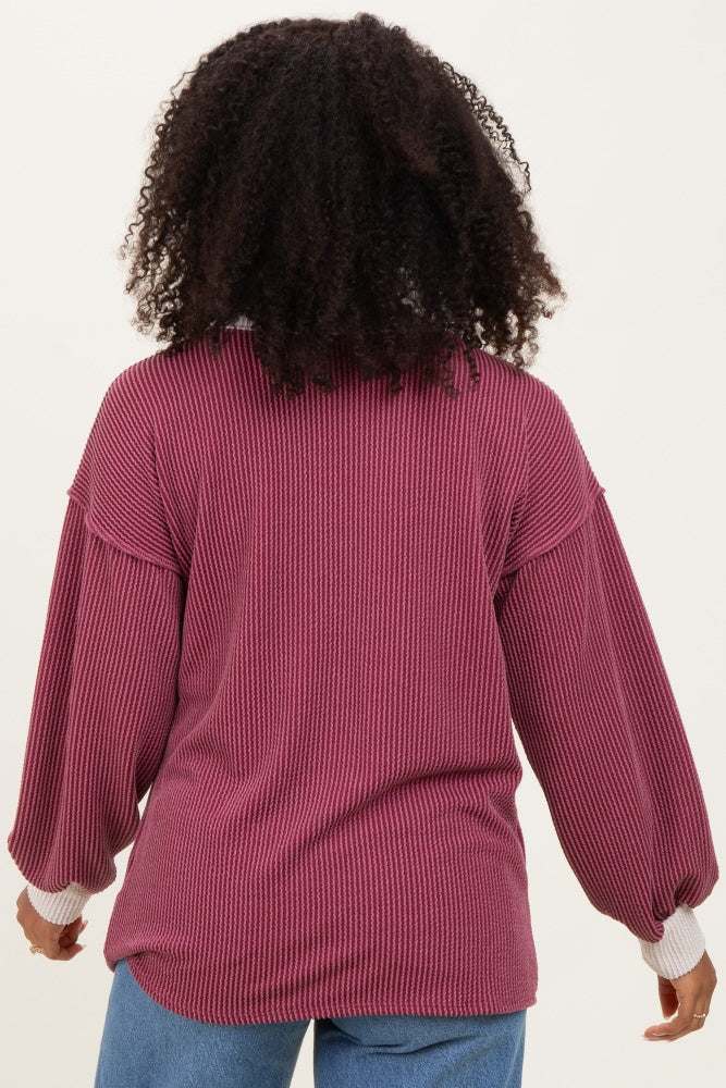 Burgundy Long Sleeve Contrast Button Detail Rib Top