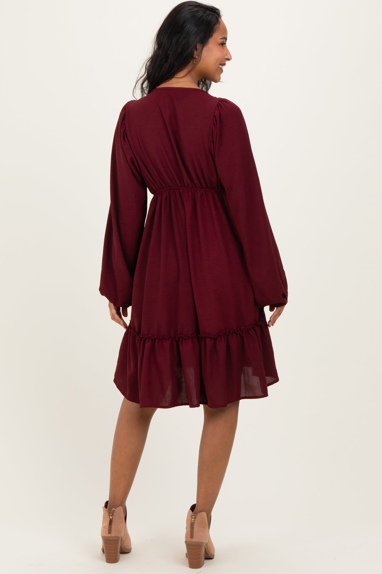 Burgundy Long Sleeve V-Neck Tiered Maternity Midi Dress
