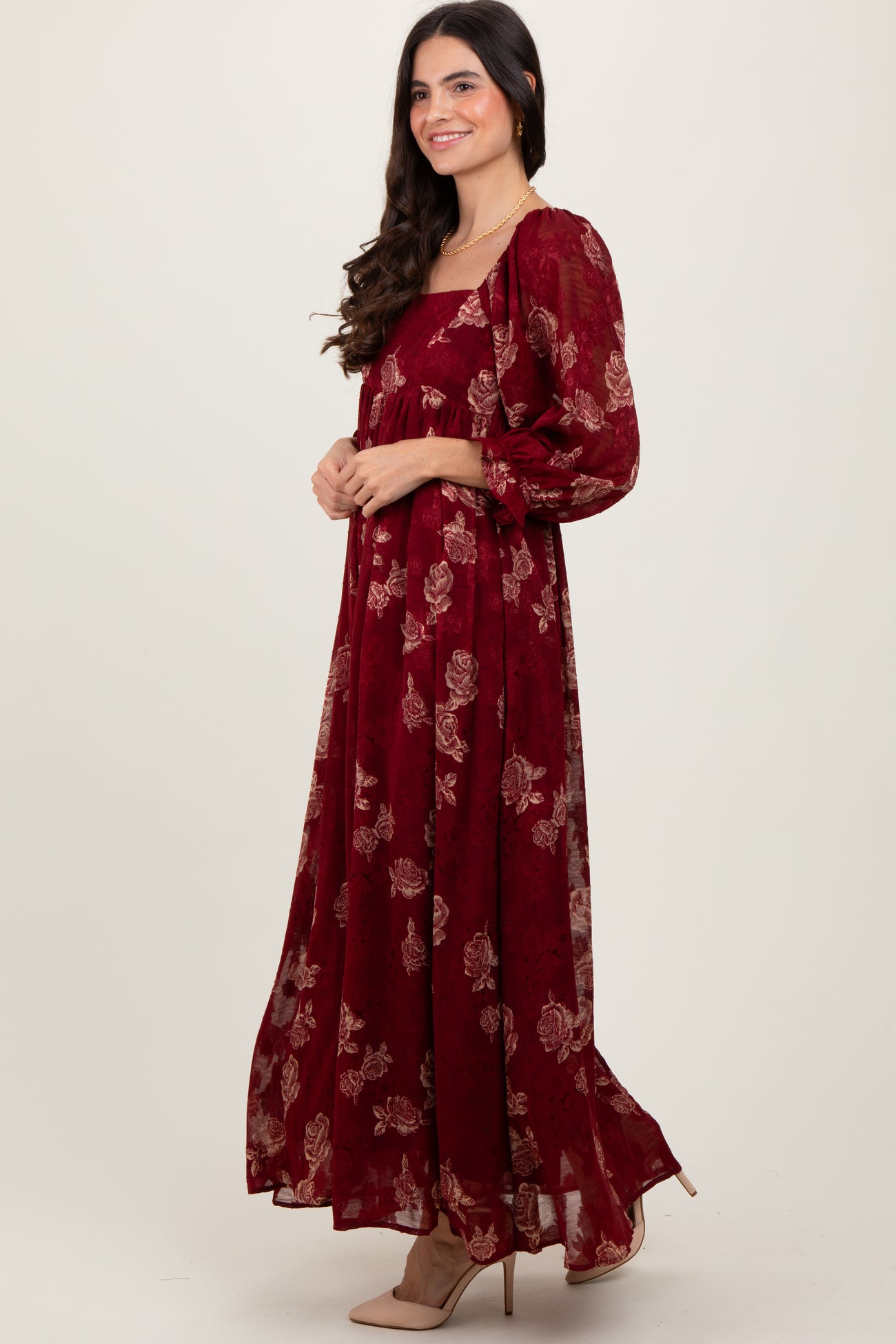 Burgundy Multi Floral Textured Peasant Babydoll Maxi Dress