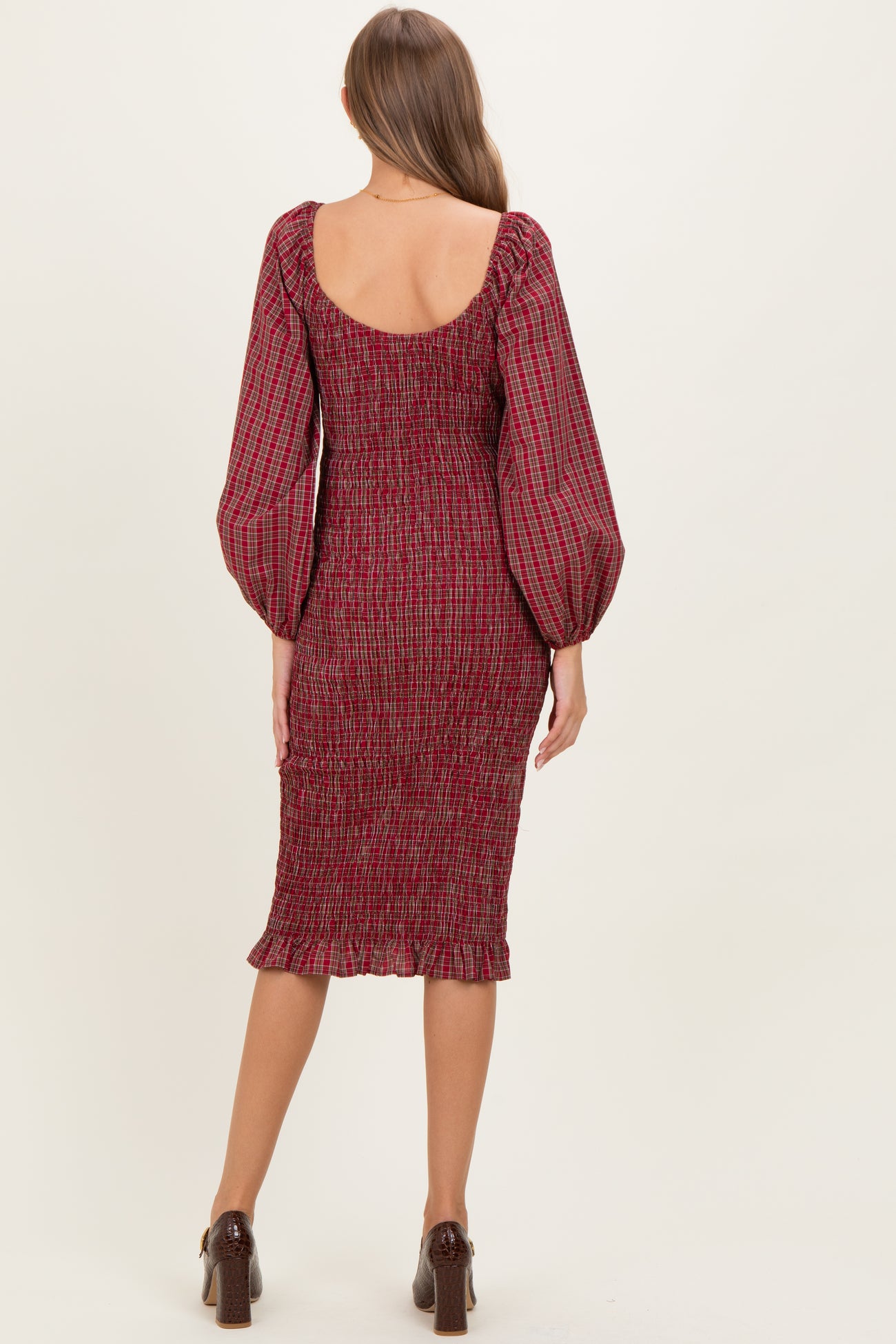 Burgundy Plaid Long Sleeve Bodycon Maternity Midi Dress
