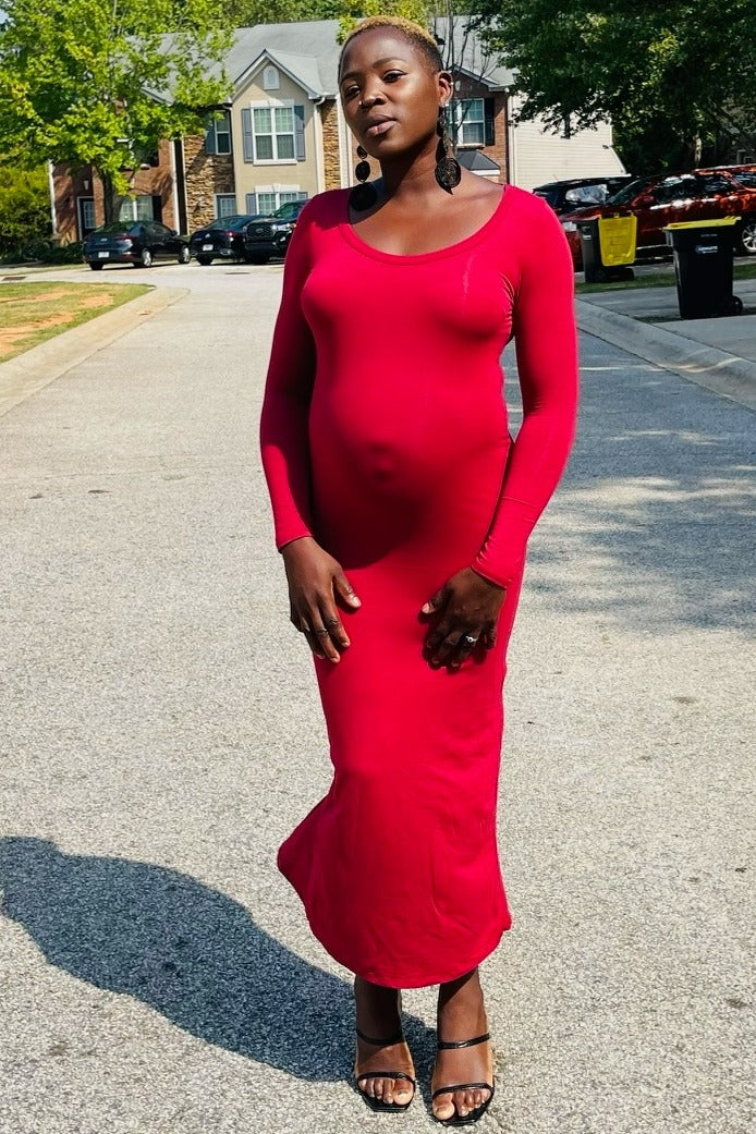 A solid hued maternity maxi dress featuring long sleeves and a scoop neckline.