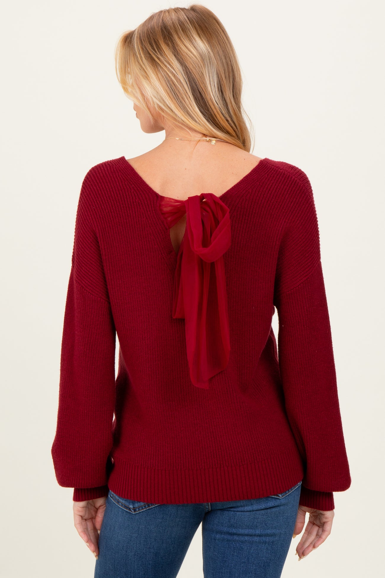 Burgundy V-Neck Drop Shoulder Back Bow Tie Detail Maternity Sweater