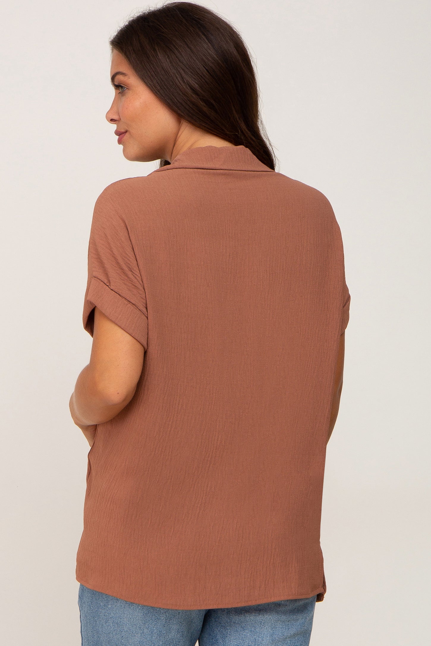 Camel Collared Button-Down Short Sleeve Maternity Blouse
