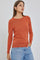 A solid hued knit top featuring long sleeves and a rounded neckline.