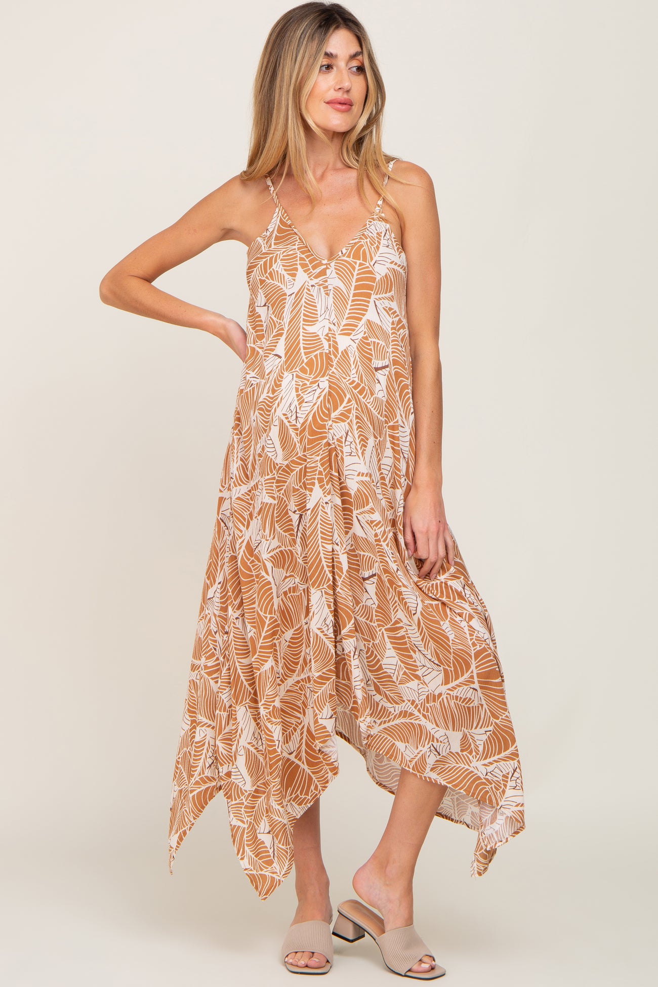 Camel Leaf Print Handkerchief Maternity Midi Dress