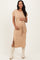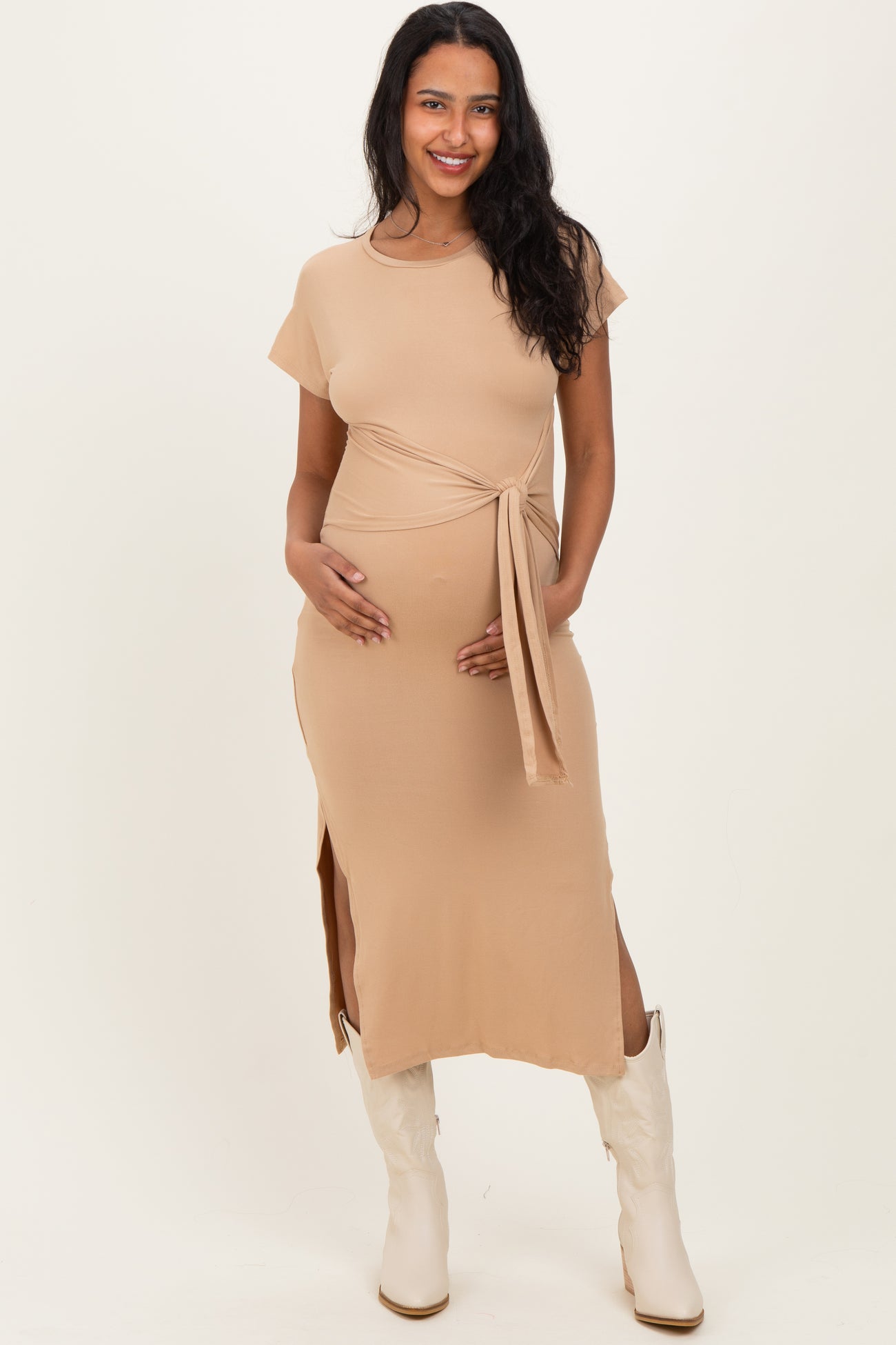 Camel Waist Tie Short Sleeve Side Slit Maternity Dress