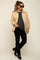 A maternity bomber jacket featuring a zip up front, long sleeves with a pocket on the arm, front pockets and a quilted lining.