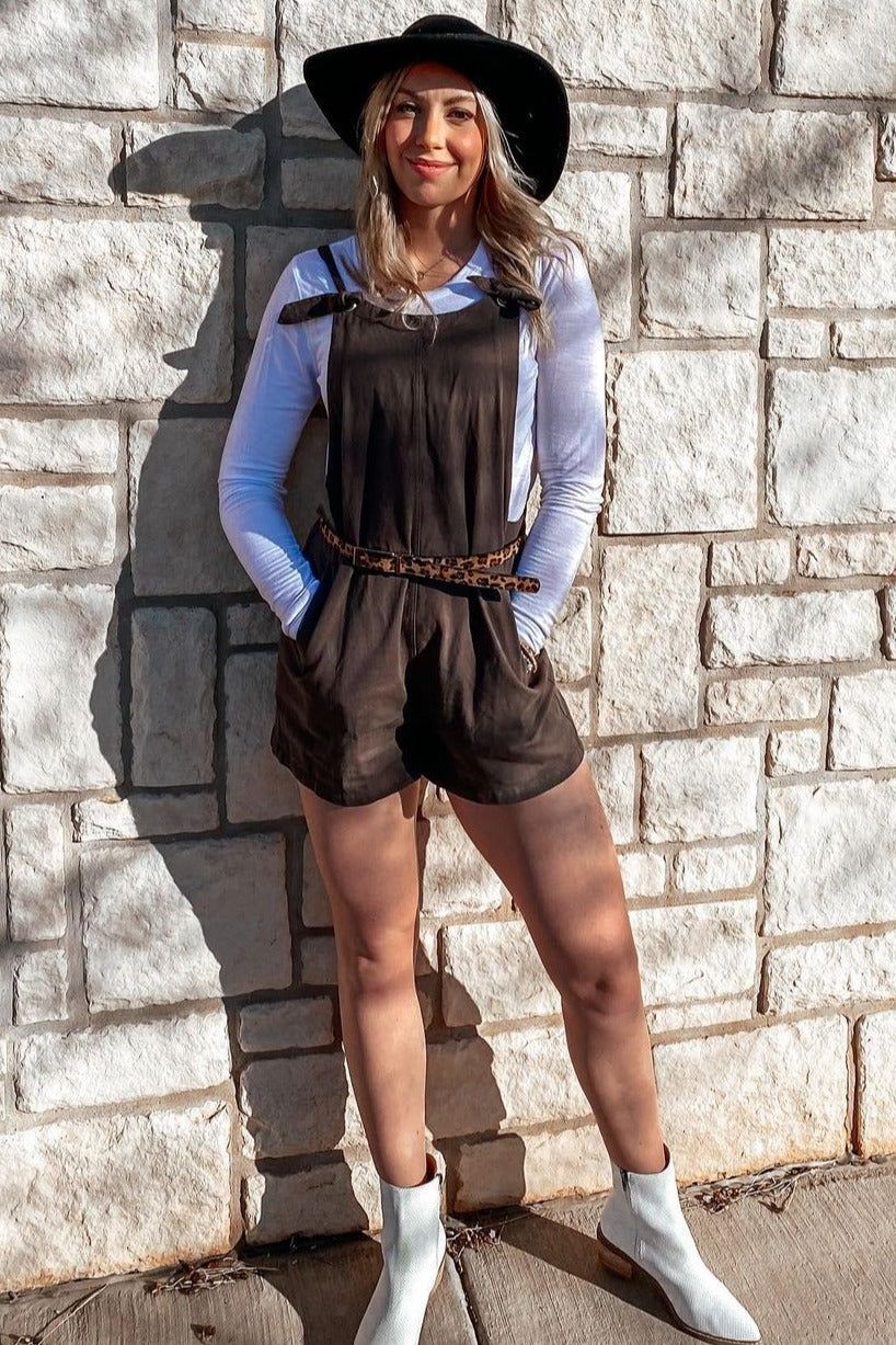 A pair of solid hued overalls featuring shorts, adjustable tie straps, a square neck and side pockets.