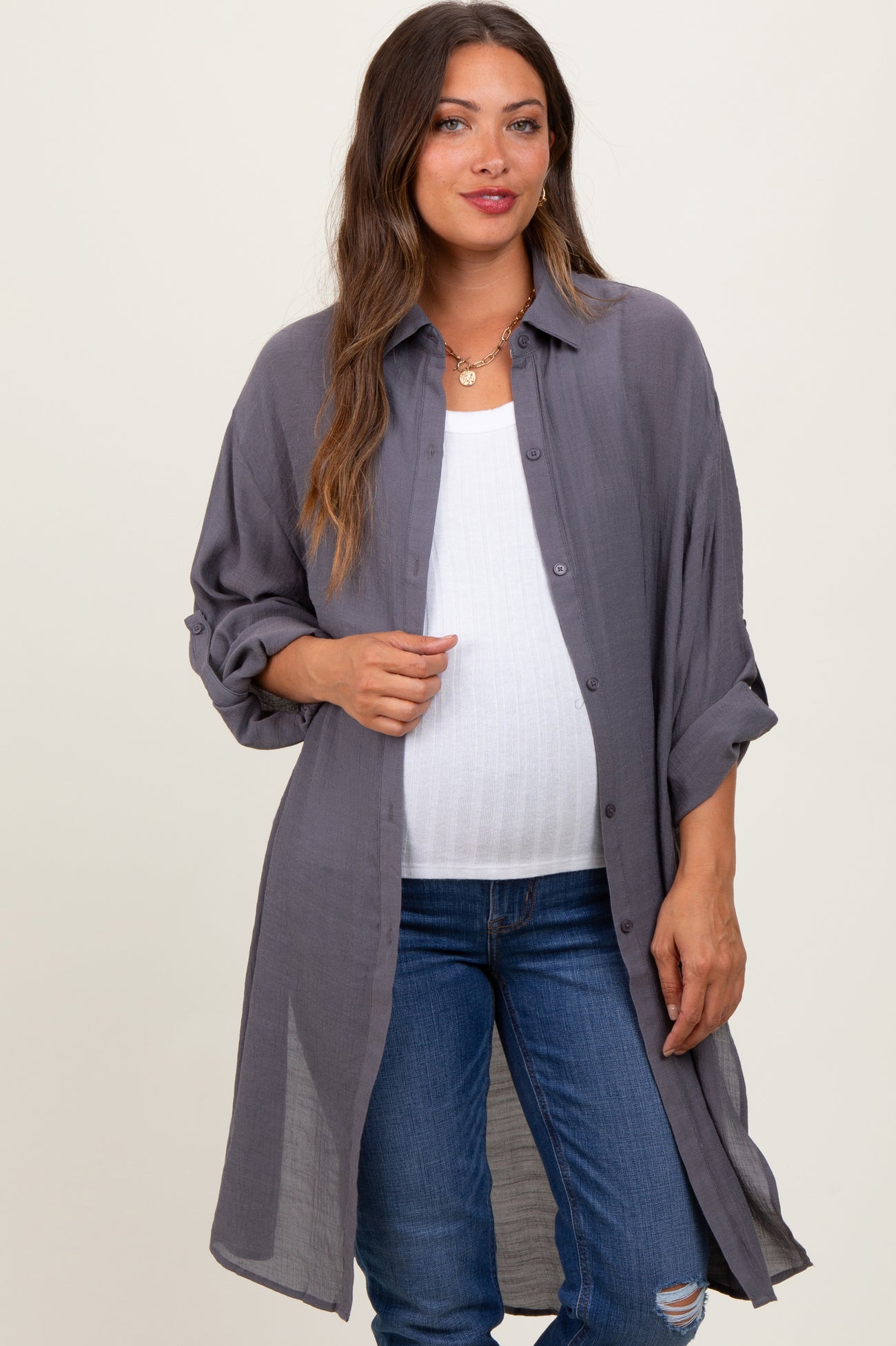 Charcoal Button Front Side Slit Oversized Maternity Blouse