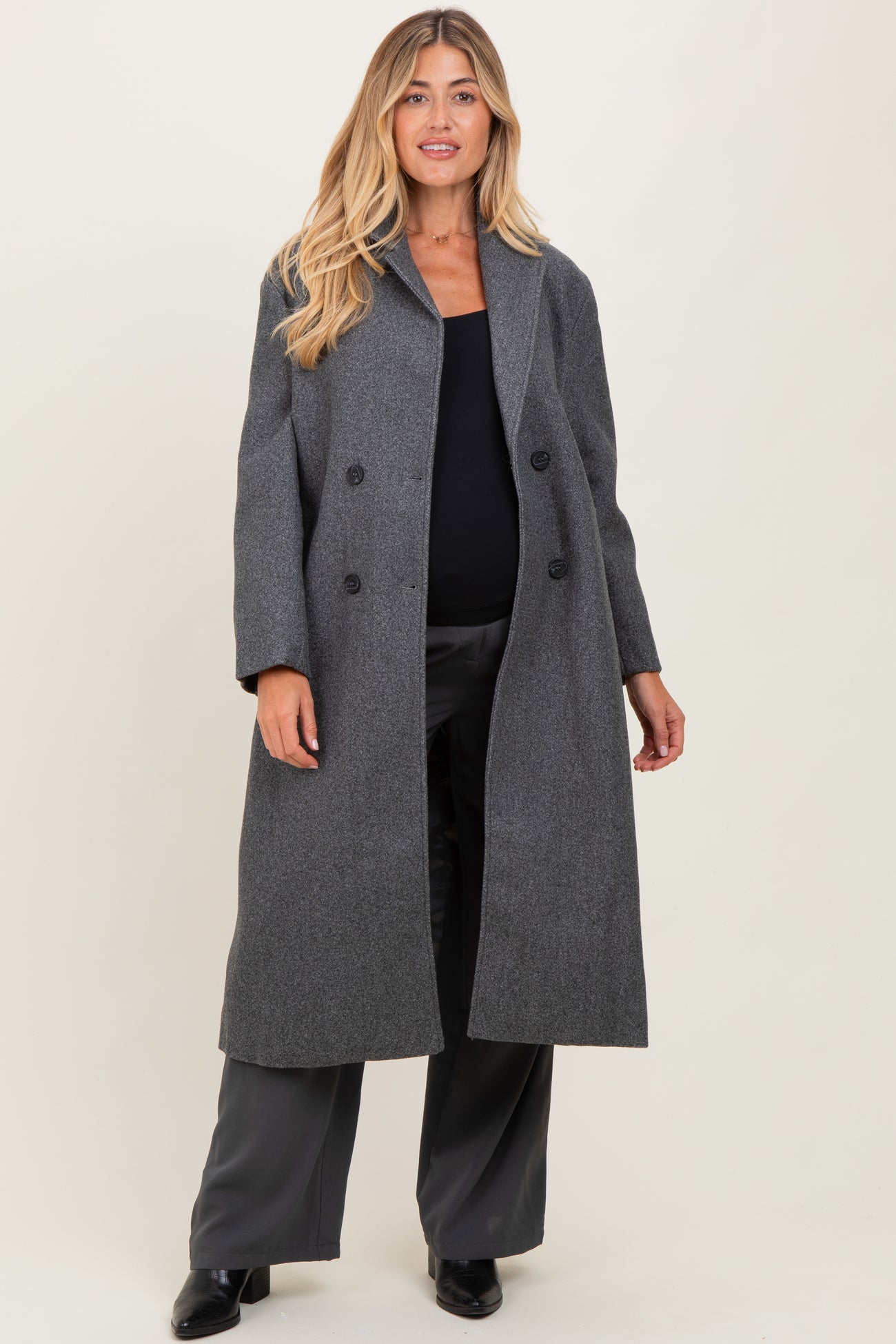 Stay chic and cozy throughout your pregnancy with our Charcoal Felted Double Breasted Lapel Duster Maternity Coat. Crafted from soft felted fabric, this elegant coat features a timeless charcoal hue, a double-breasted front with classic black buttons, and wide lapels for a sophisticated touch. Its long, relaxed silhouette provides plenty of room for your growing bump, making it perfect for layering over maternity outfits. Designed to combine comfort and style, this versatile duster coat is your go-to for cooler days and makes a polished addition to your maternity wardrobe. Easy to wear, effortless to love.