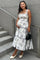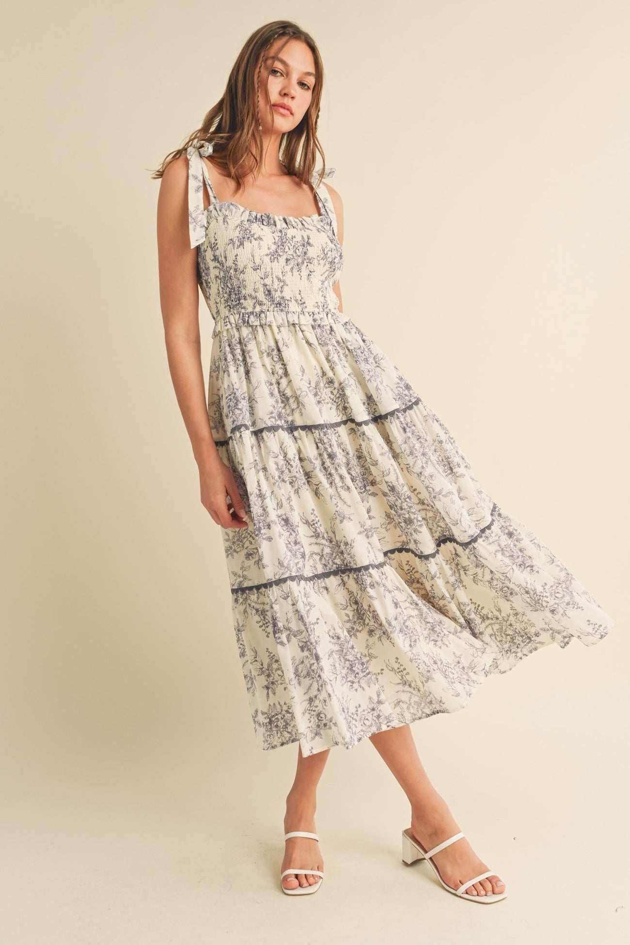 A floral sleeveless maternity midi dress featuring knotted shoulder straps, a smocked top, side pockets, a tiered skirt and a square neckline.