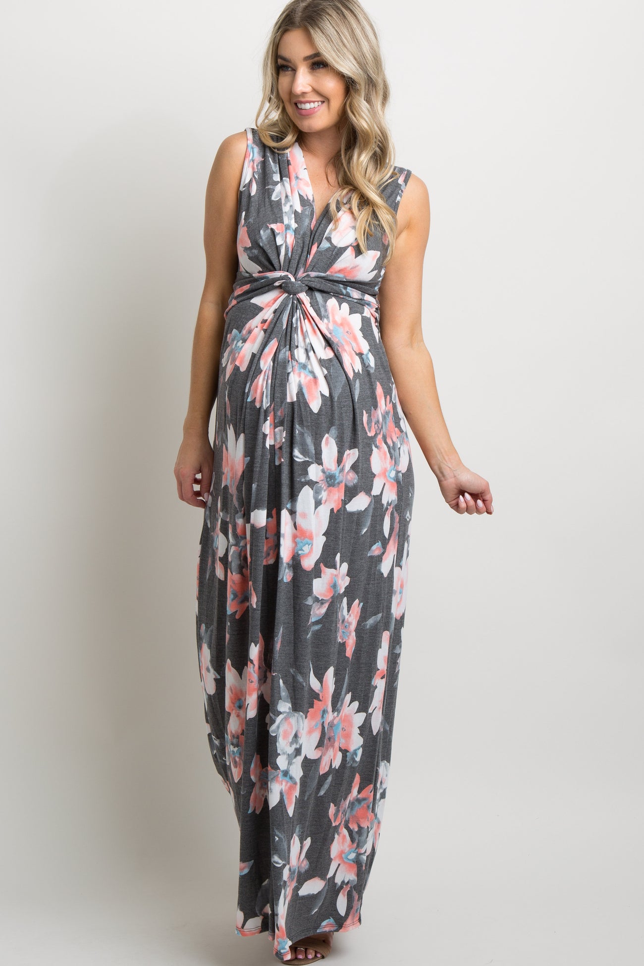Charcoal Grey Floral Sleeveless Knot Front Maternity Maxi Dress