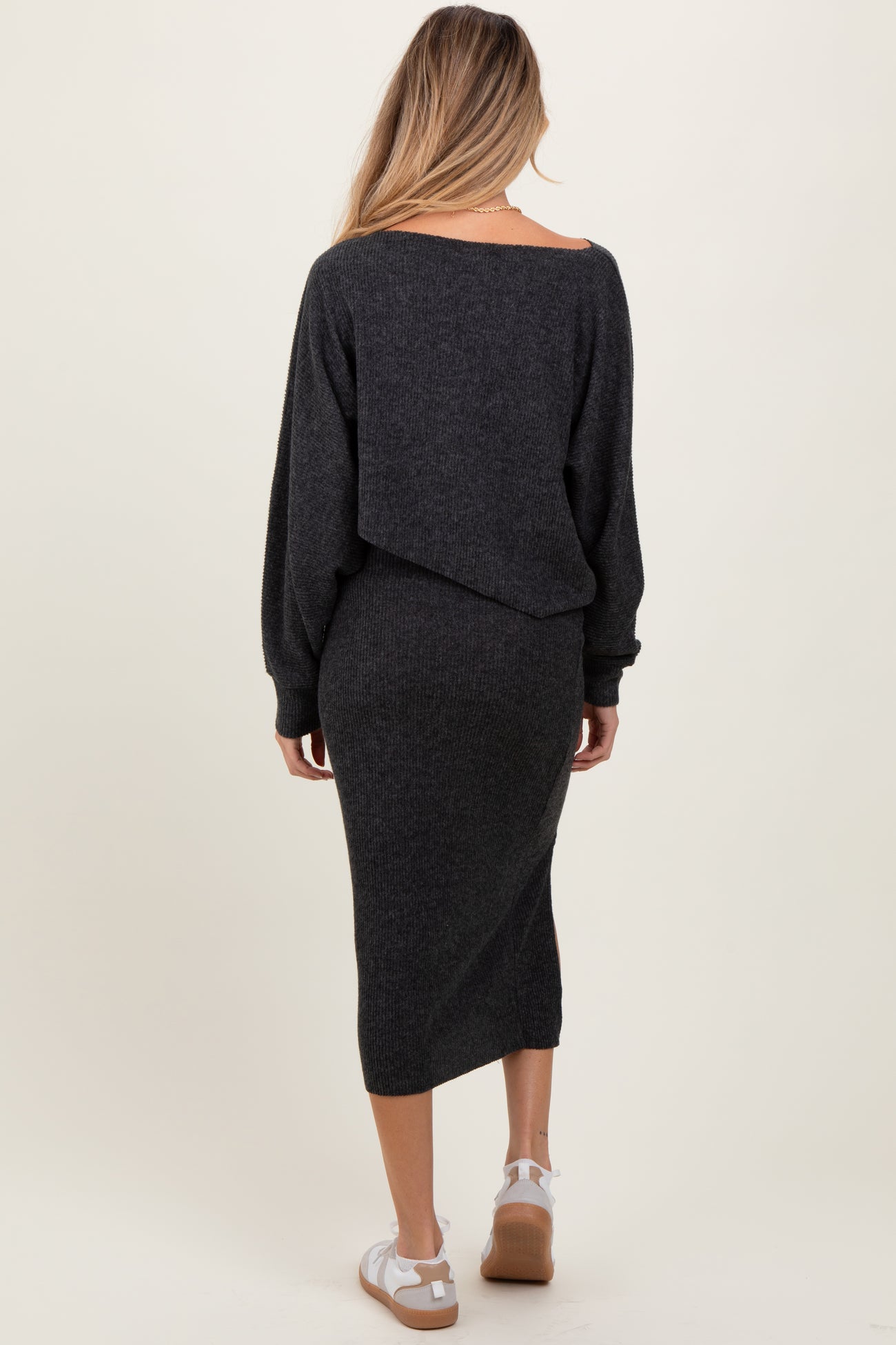 Charcoal Ribbed Knit Asymmetric Top Midi Skirt Maternity Set