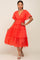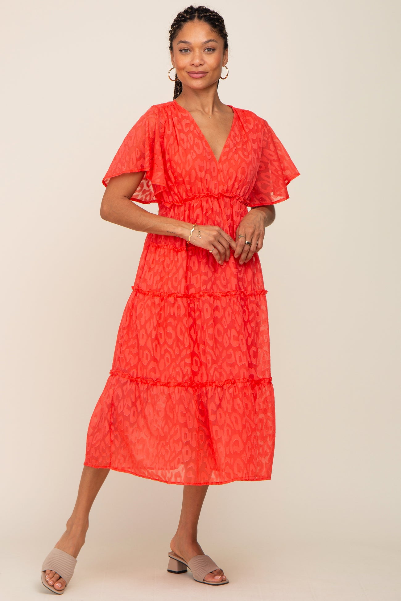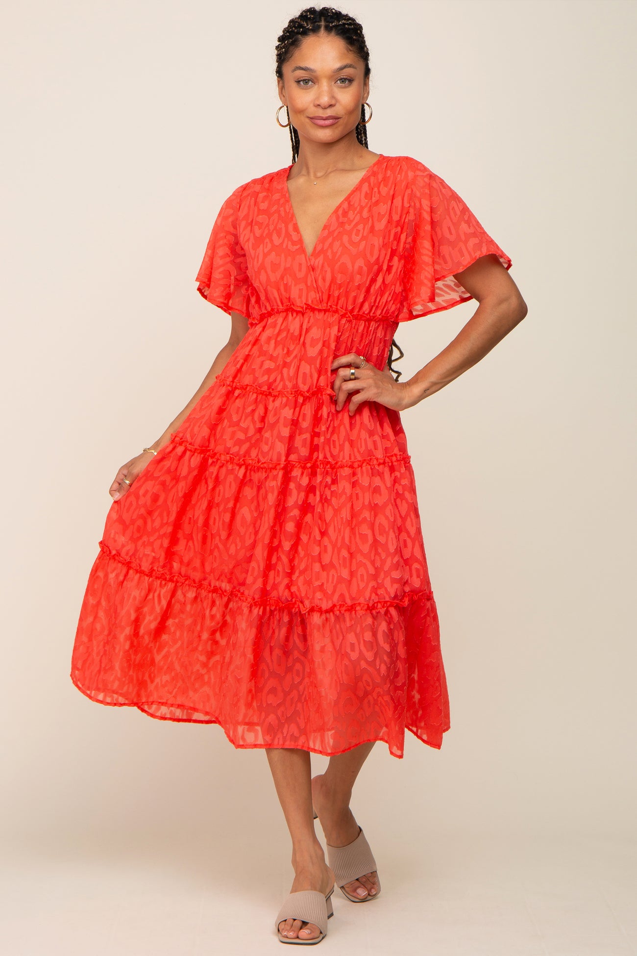 A printed chiffon tiered midi dress with a v-neckline, flutter sleeves and ruffle accents. Dress is partially lined. Sleeves and back are semi sheer.