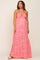 Details A floral print maternity maxi dress featuring a self-tie halter neckline and a smocked neckline. Content + Care