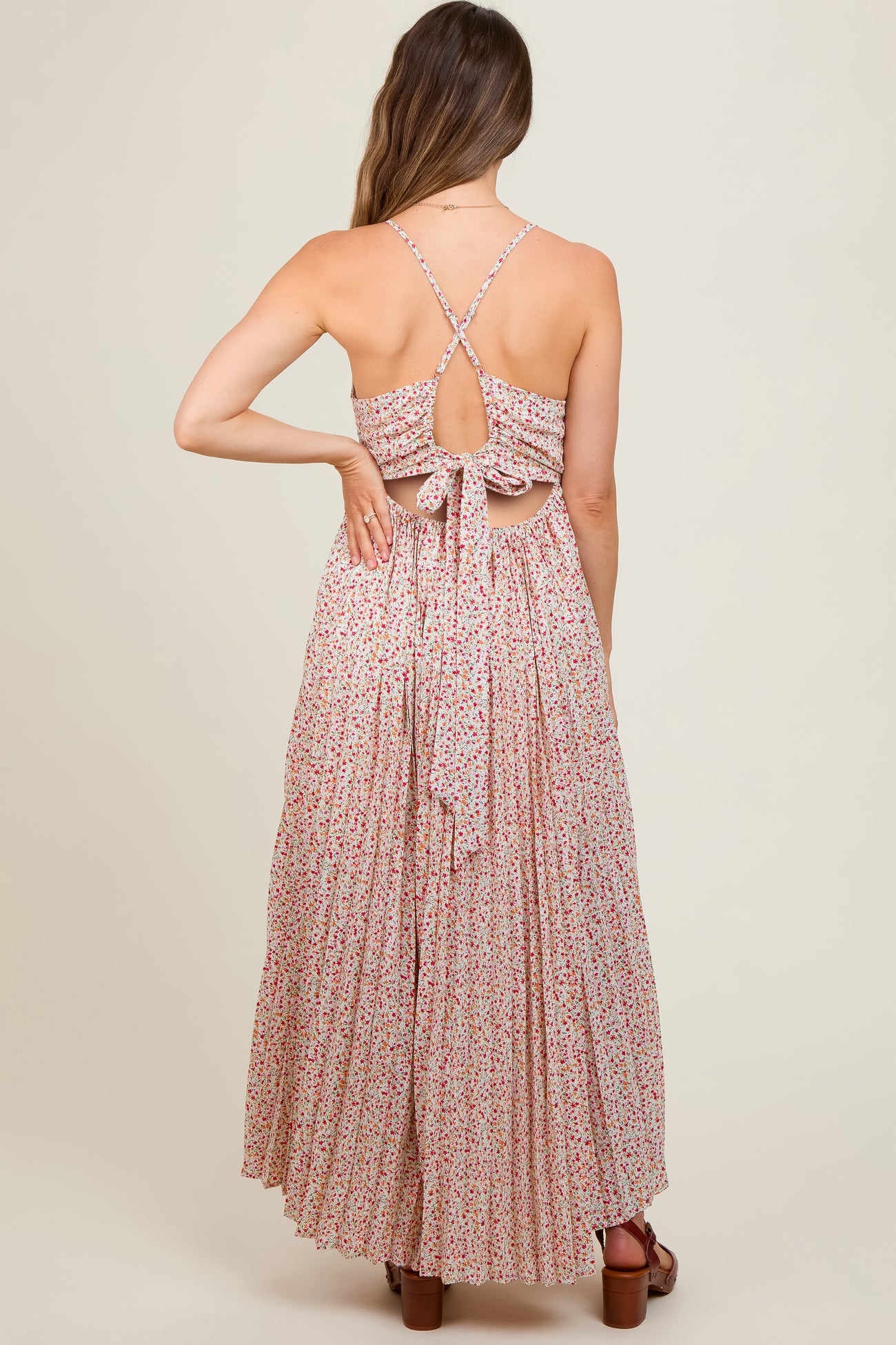 Coral Floral Pleated Cutout Back Maternity Maxi Dress