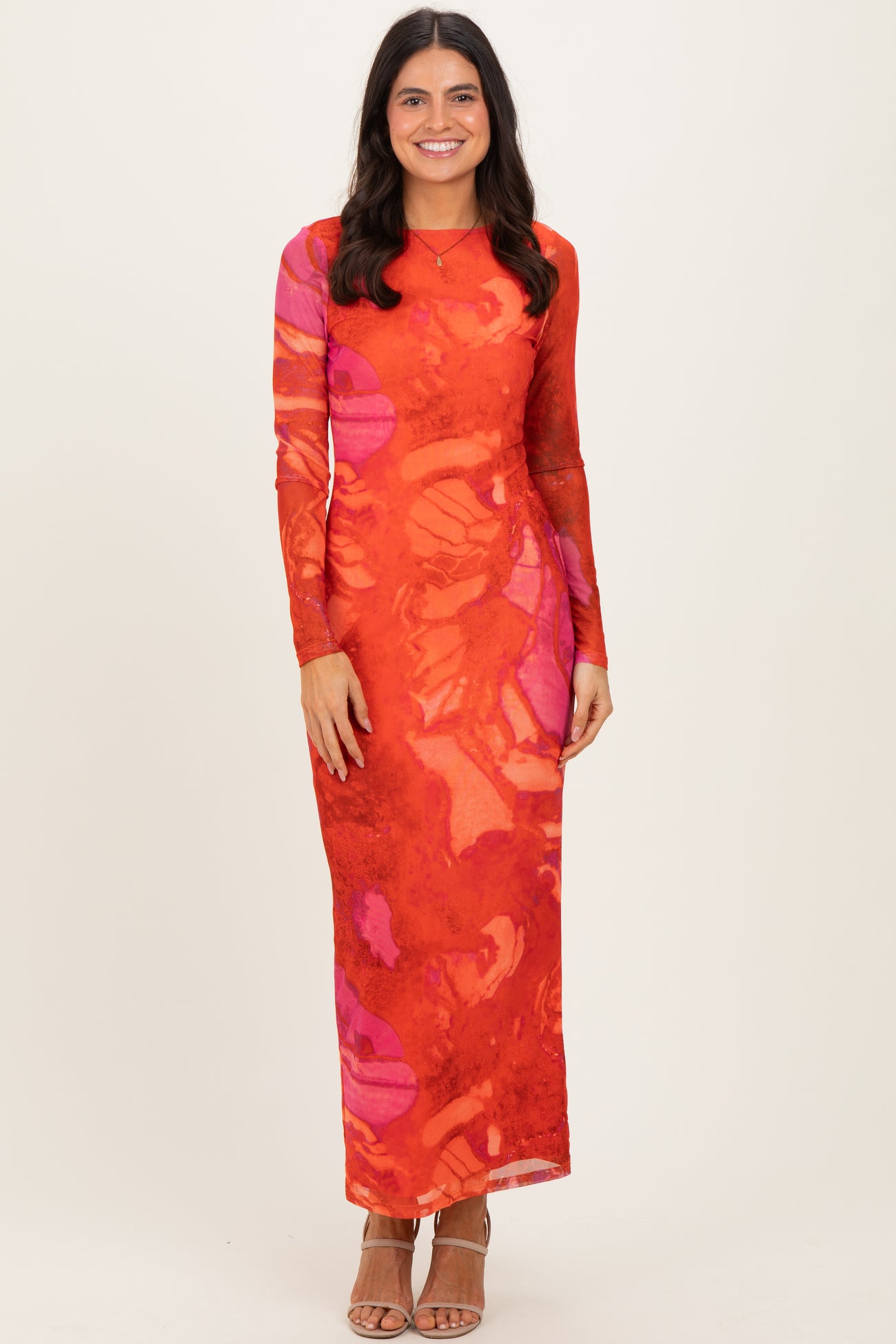 Coral Printed Mesh Open Back Maternity Maxi Dress