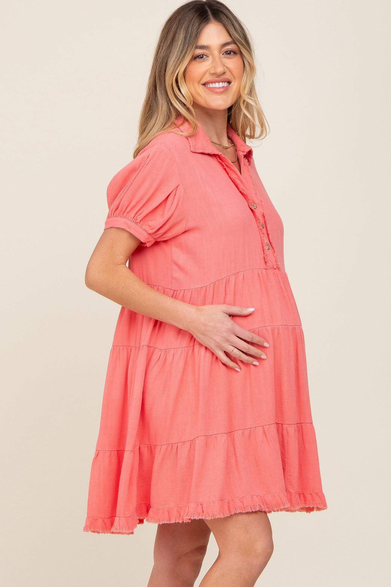 A linen maternity dress with short puff sleeves, a collar, front functioning buttons, a tiered skirt, and a frayed hem.