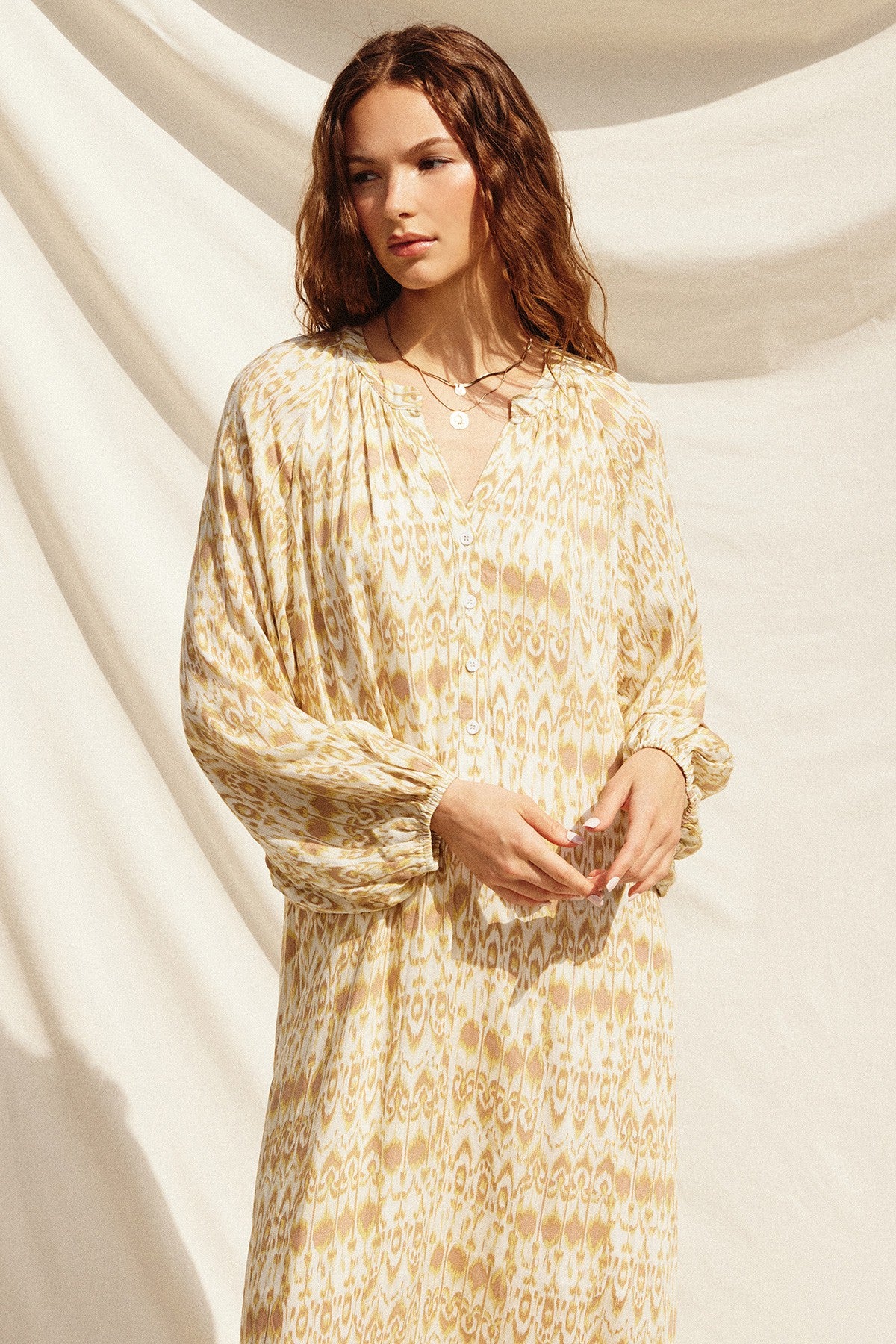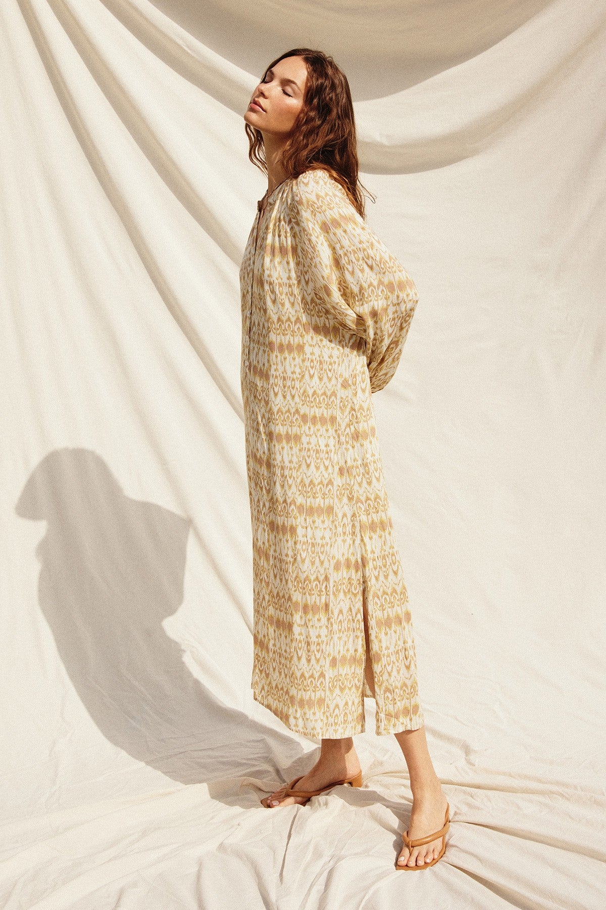 A printed midi dress featuring a split v-neckline, 3/4 length puff sleeves, a button front with an adjustable tassel tie, side slits and a slight hi-low hem.
