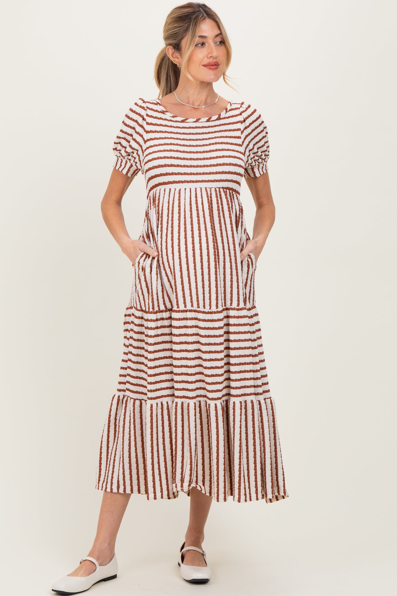 Cream/Camel Striped Short Sleeve Tiered Maternity Maxi Dress