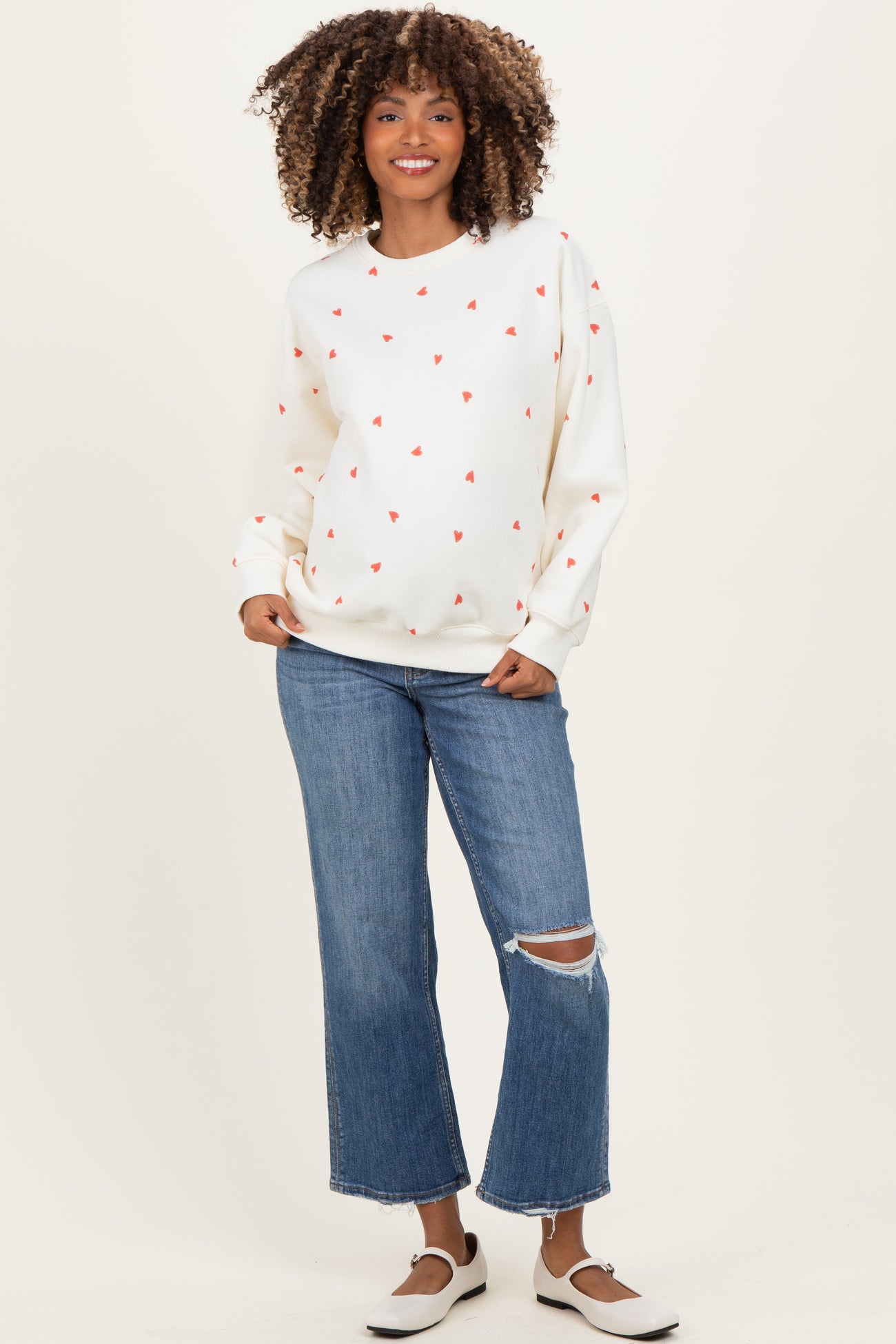 Stay cozy and stylish throughout your pregnancy with this Crew Neck Heart Print Maternity Sweatshirt. Designed with a relaxed fit to comfortably accommodate your growing bump, it features soft, breathable fabric that keeps you warm without feeling heavy. The timeless crew neck and ribbed cuffs add classic comfort, while the delicate heart prints bring a playful and charming touch to your maternity wardrobe. Perfect for casual days or layering on cooler evenings, this sweatshirt pairs effortlessly with jeans or leggings. Embrace comfort and cuteness all season long with this essential maternity piece. Ideal for moms-to-be who want both fashion and function.