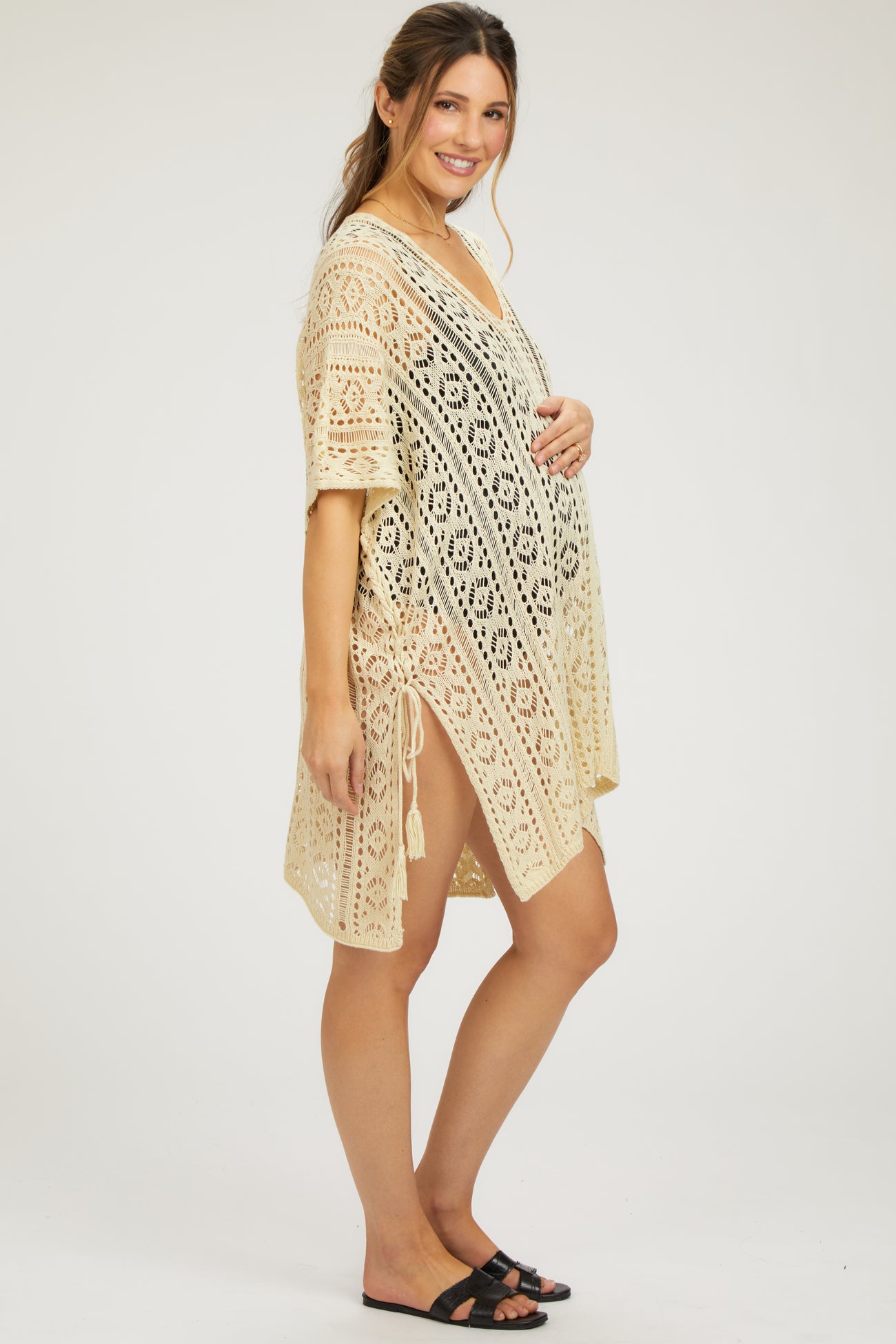 A solid lightweight crochet knit maternity swim cover up featuring two side slits and tassel detail.