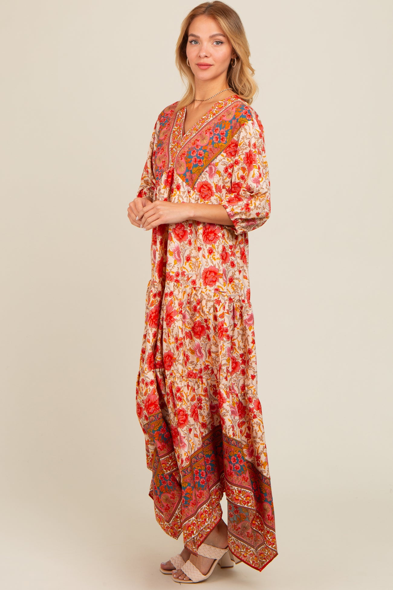 Cream Floral Border Print V-Neck Tiered Midi Dress