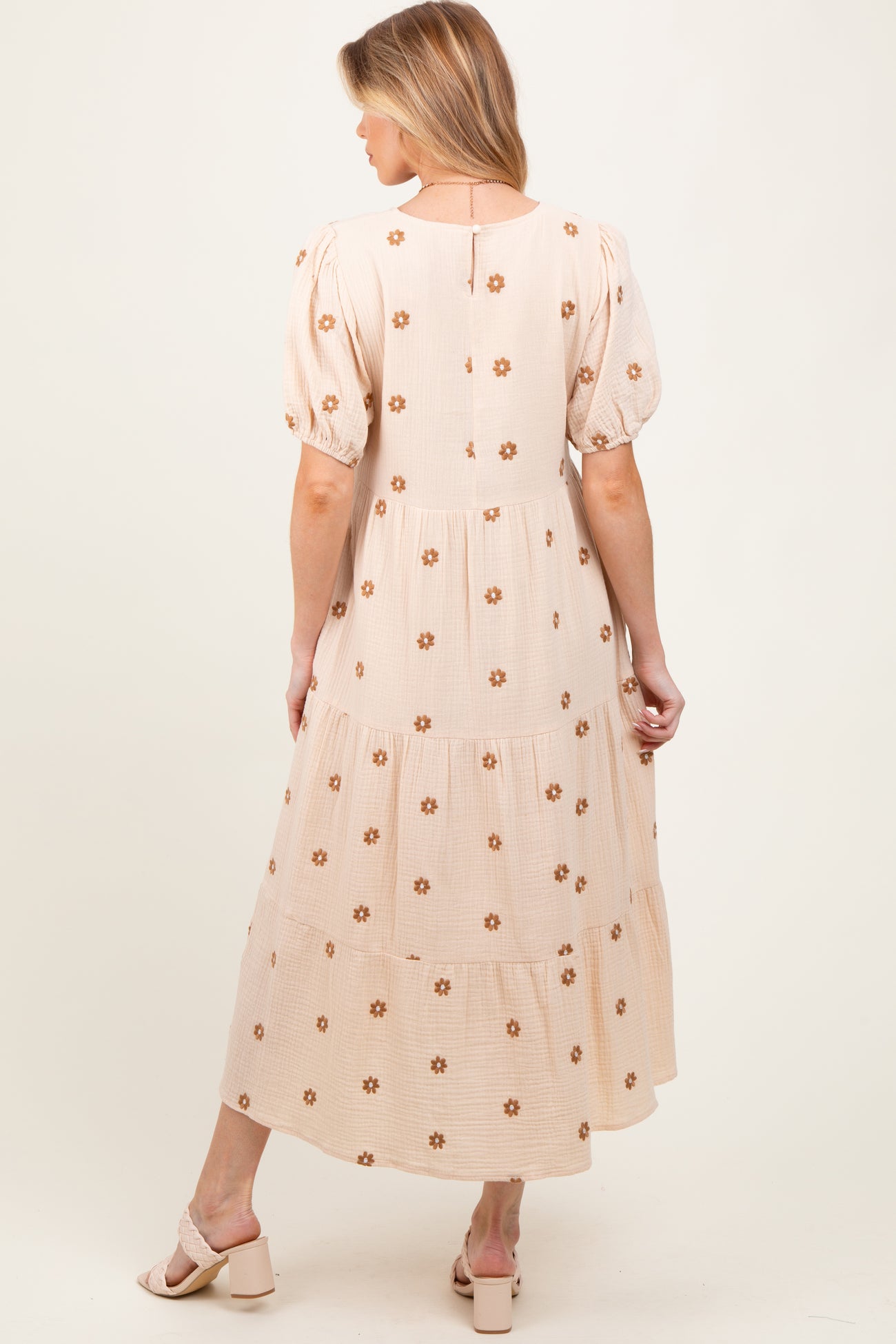 Cream Floral Embroidered Tiered Maternity Midi Dress
