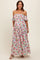 Floral off the shoulder maternity dress with a smocked bodice, side pockets, and ruffle sleeves.
