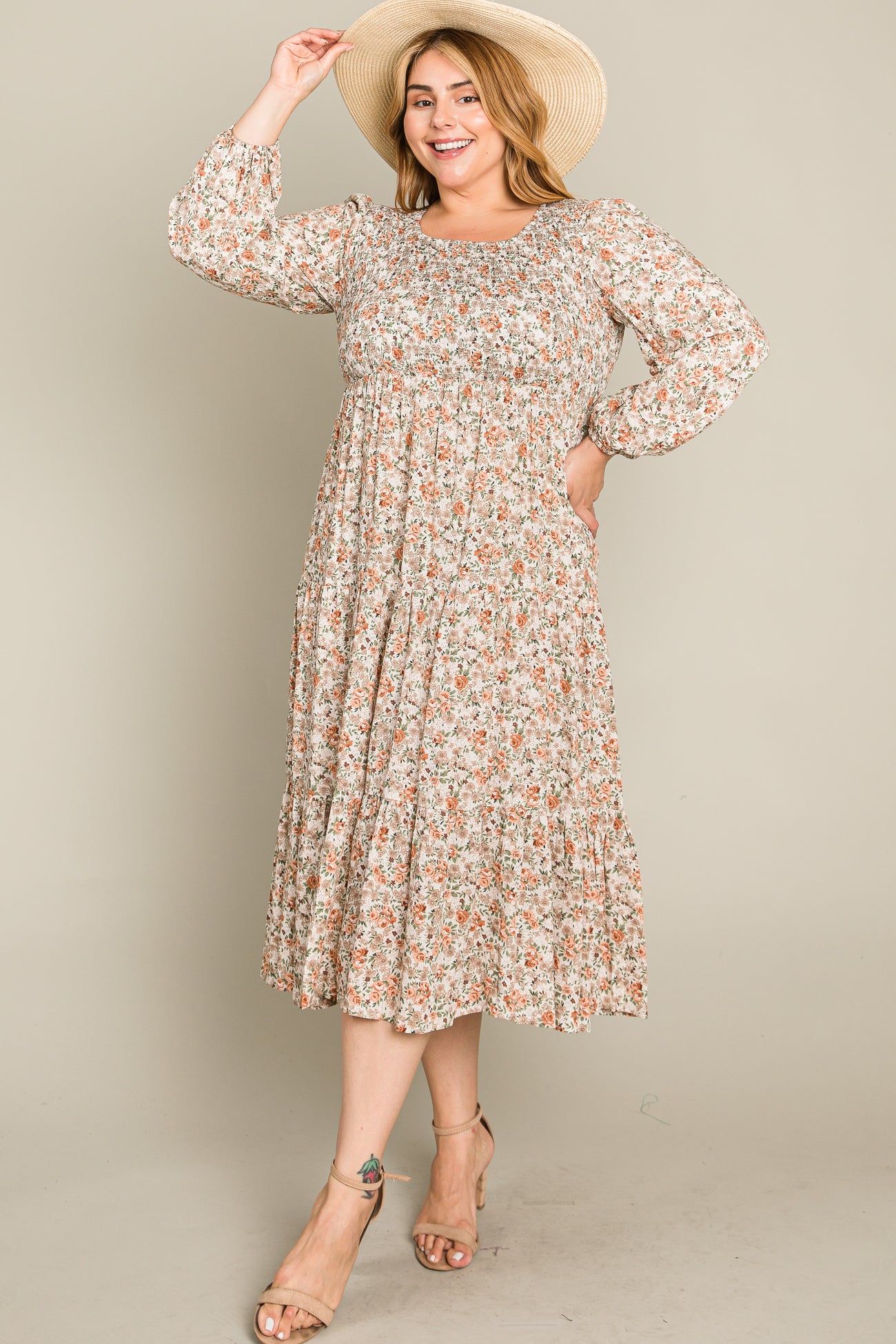 Cream Floral Smocked 3/4 Sleeve Plus Midi Dress