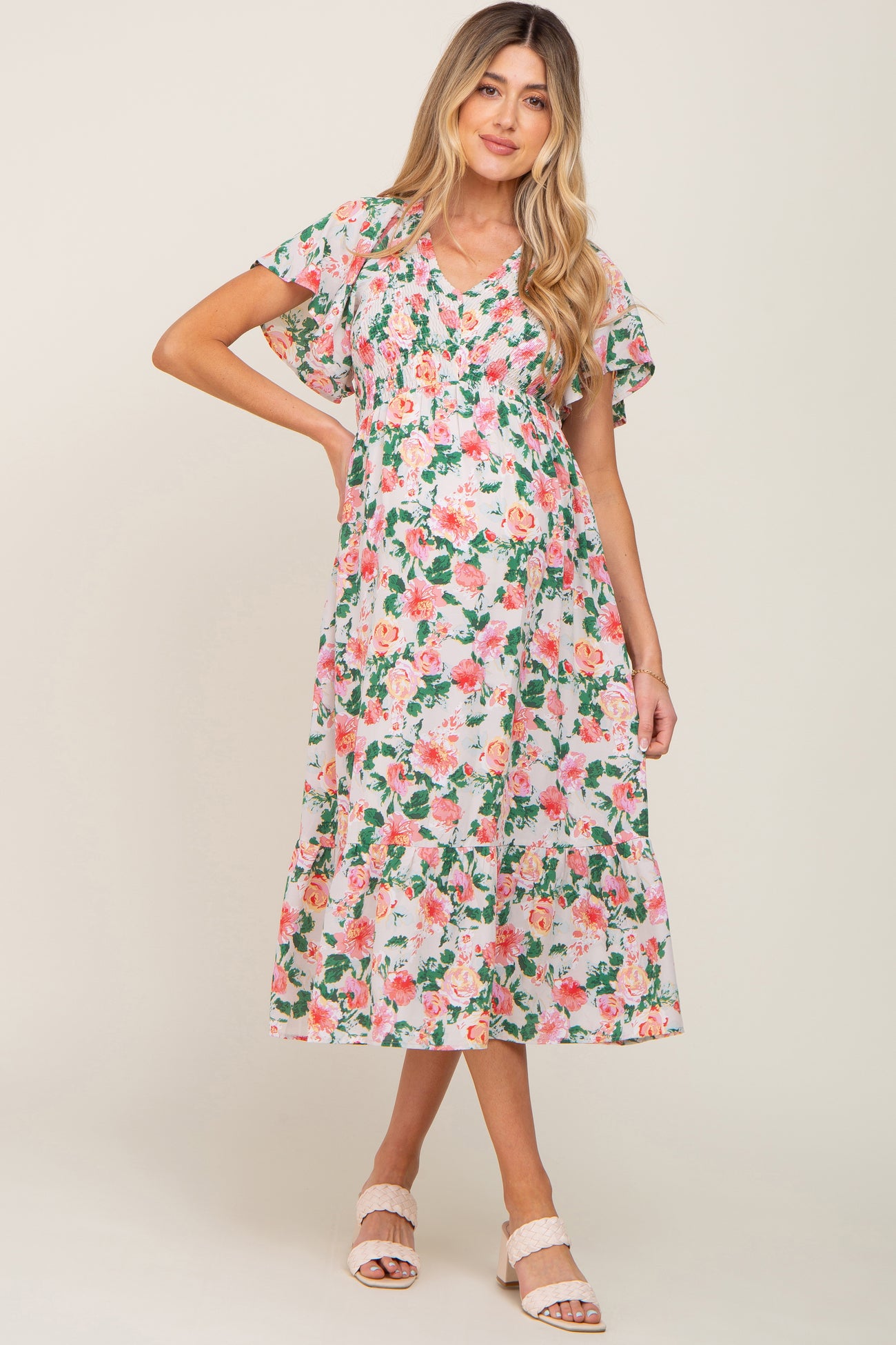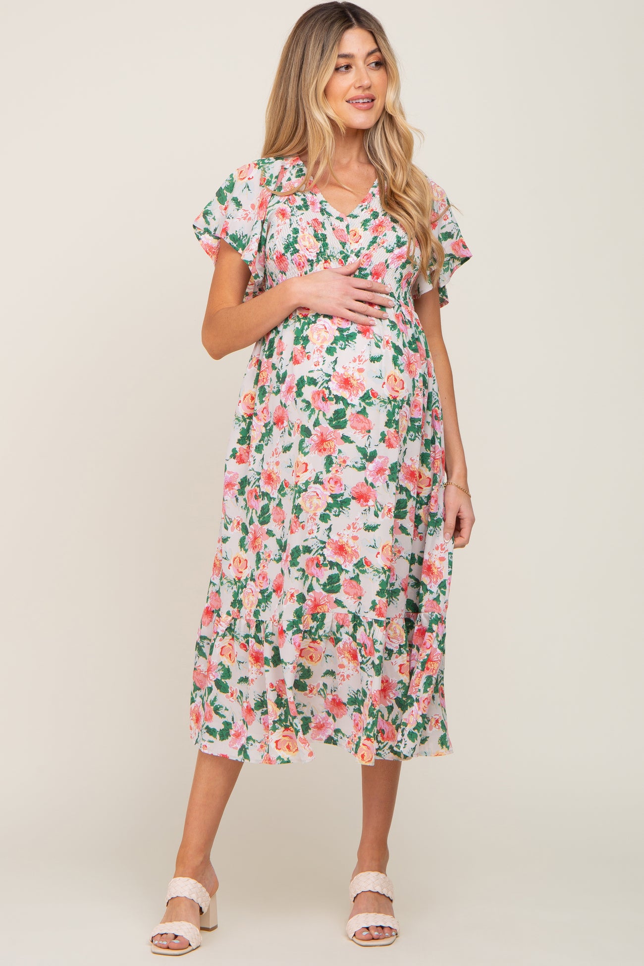Cream Floral Smocked Flutter Sleeve Maternity Midi Dress