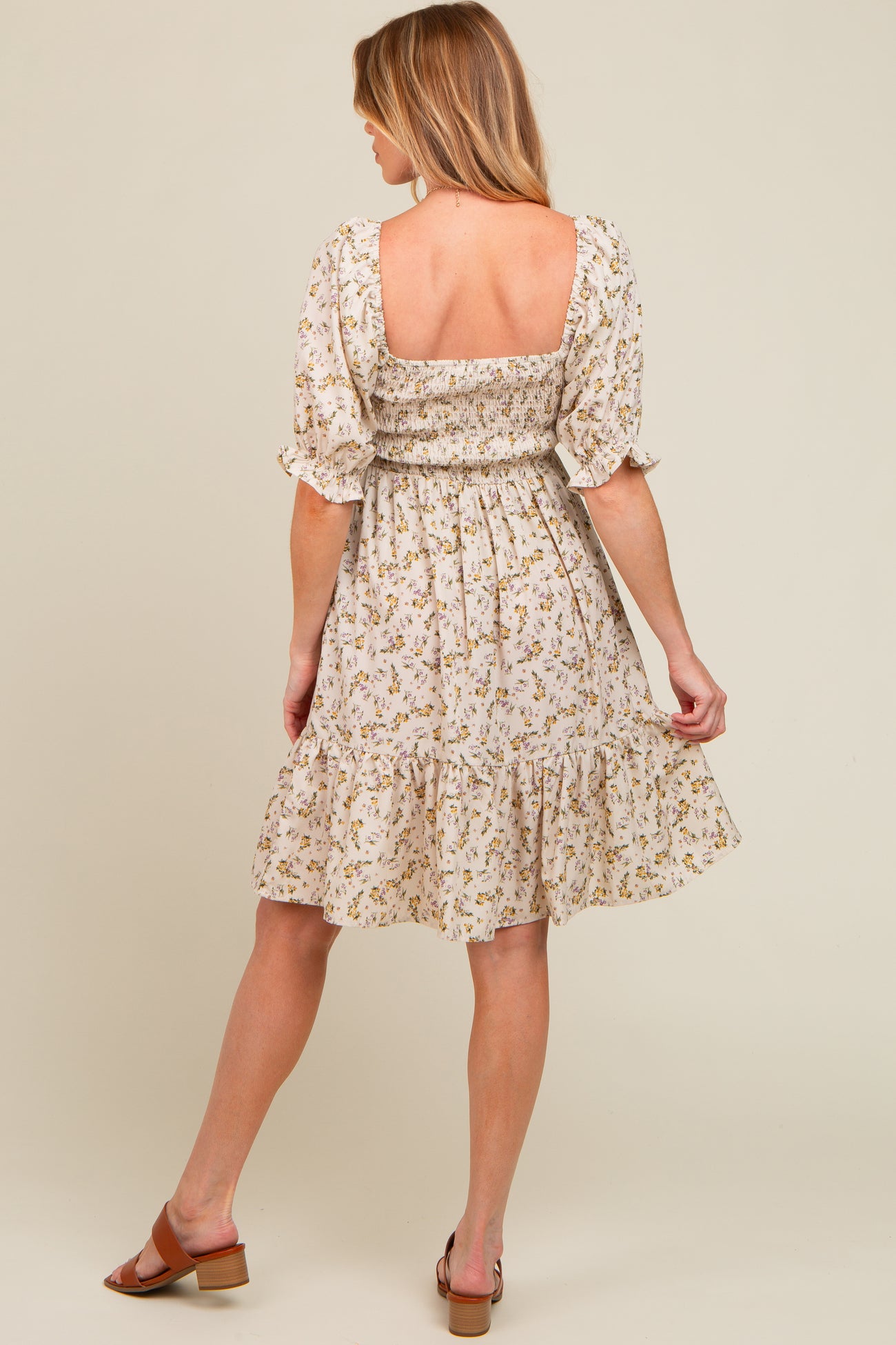 Cream Floral Smocked Puff Sleeve Maternity Dress