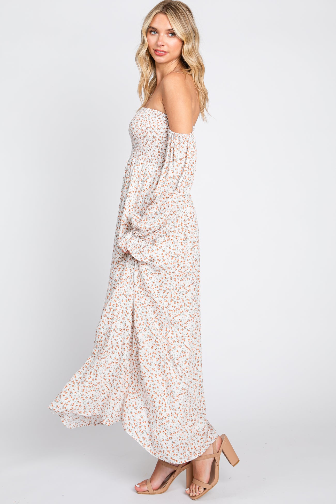 Cream Floral Square Neck Smocked Long Sleeve Maxi Dress