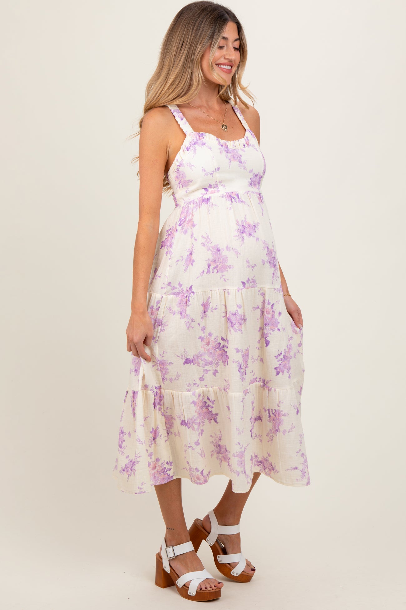 Cream Floral Tiered Crisscross Back Maternity Midi Dress