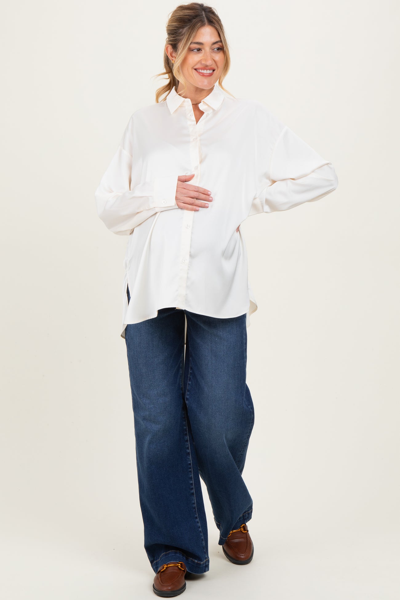 Cream Long Sleeve Oversized Satin Maternity Shirt