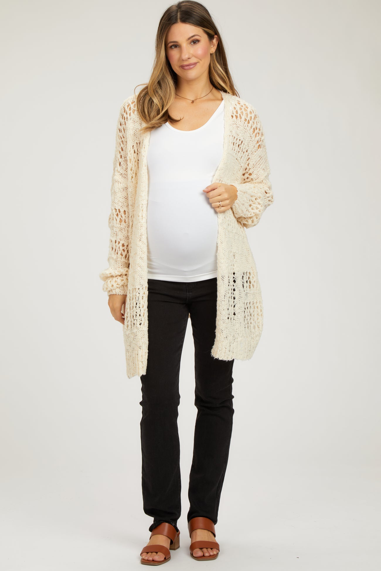 An open knit maternity cardigan featuring long sleeves and an open front.
