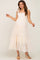 A mesh maternity midi dress featuring a smocked bodice, adjustable shoulder ties, and a ruffle tiered skirt.