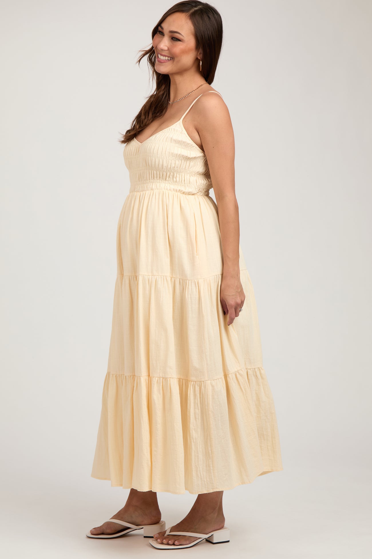 Cream Smocked V-Neck Sleeveless Tiered Maternity Midi Dress