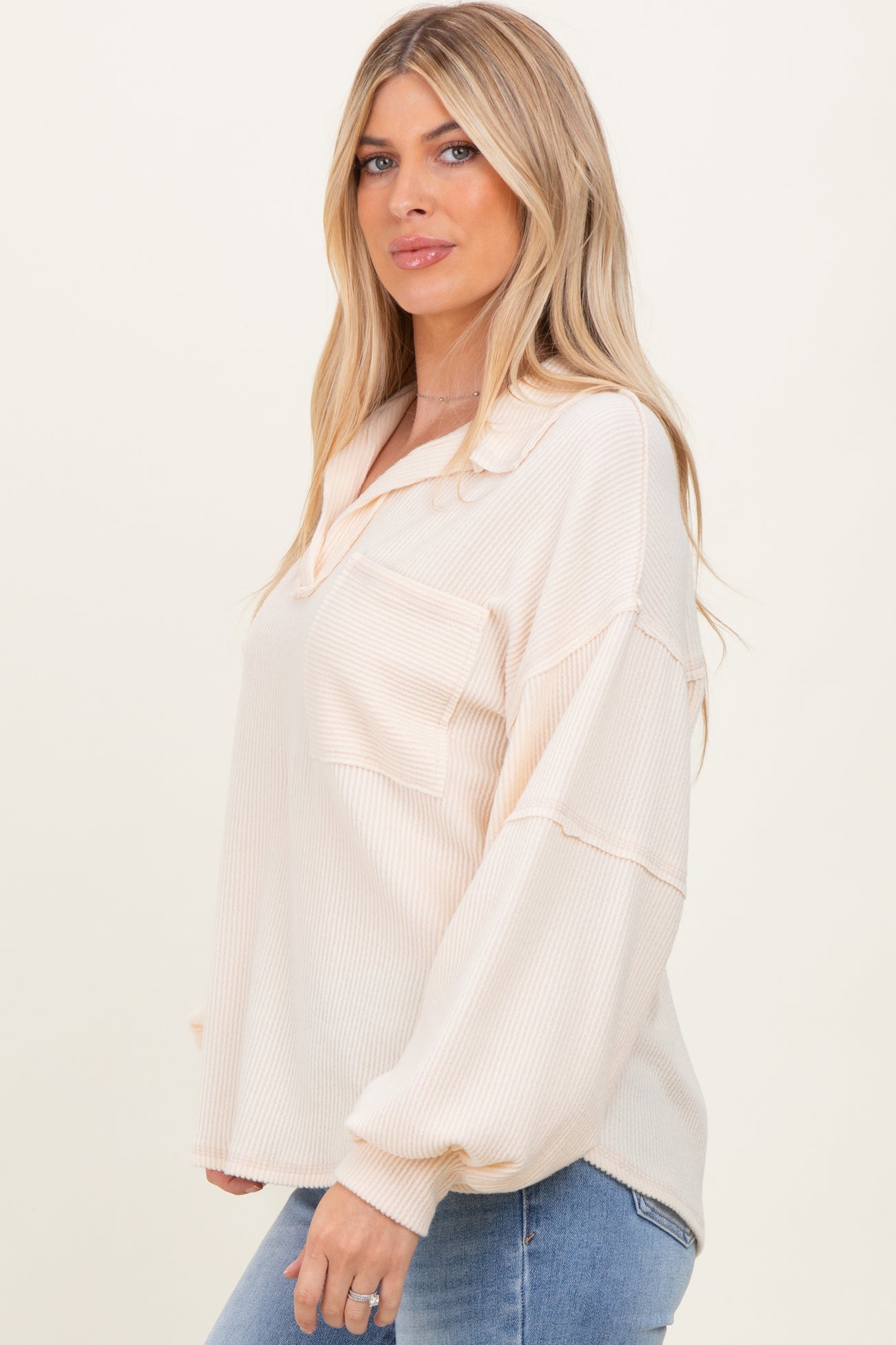 Elevate your casual wardrobe with this Cream Solid Ribbed Long Sleeve Pocketed Top. Featuring a classic collared V-neck design and a relaxed fit, this top combines comfort and style effortlessly. The ribbed texture adds subtle dimension, while the chest pocket adds a practical, trendy touch. Balloon sleeves with cuffed wrists provide a cozy, fashion-forward silhouette perfect for layering or wearing alone. Crafted from soft, breathable fabric, this versatile piece pairs beautifully with your favorite jeans or skirts for an easy, chic look any day of the week. A must-have staple for timeless style and comfort.