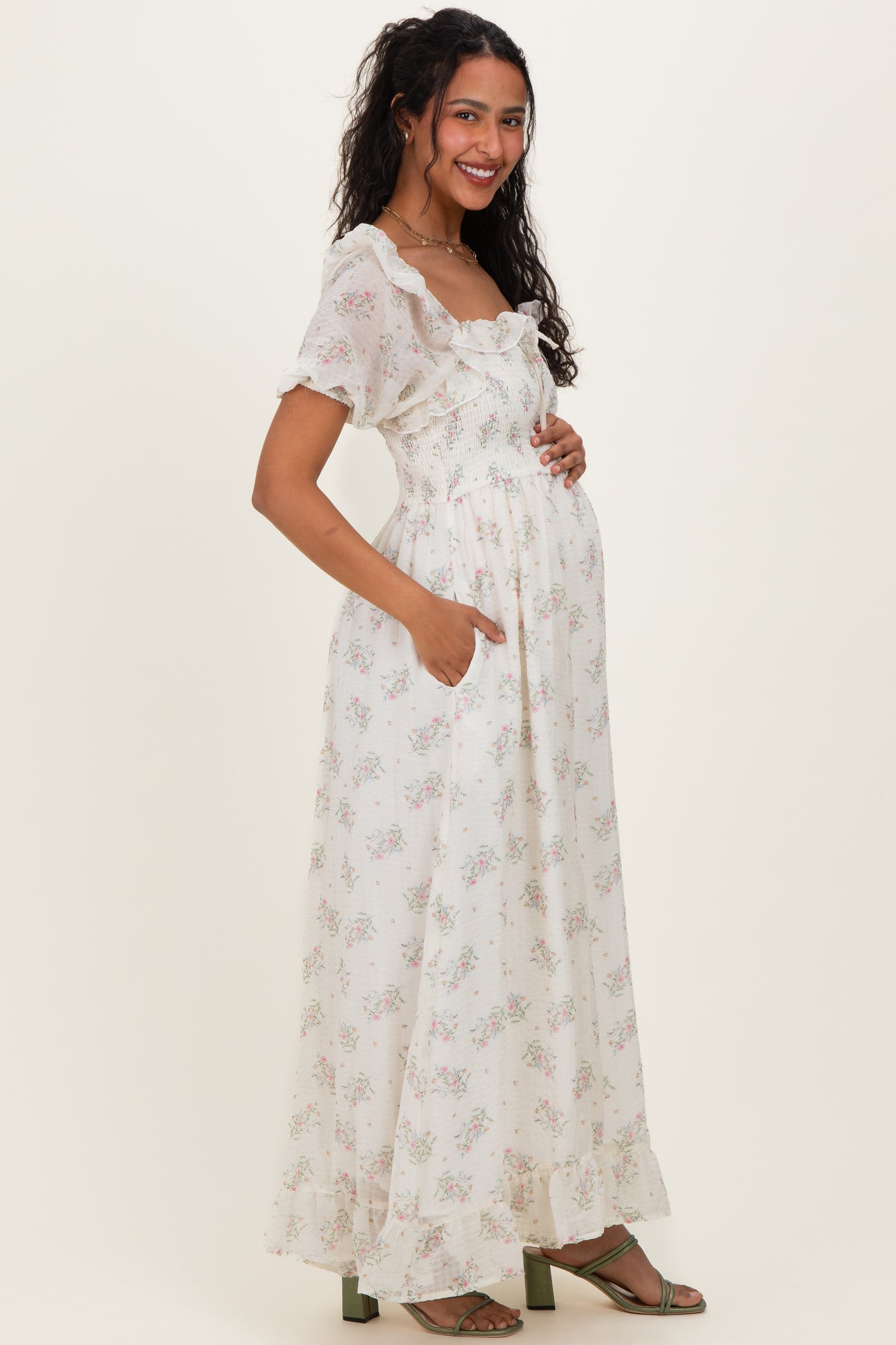 Creme Floral Chiffon Smocked Ruffle Maternity Maxi Dress
