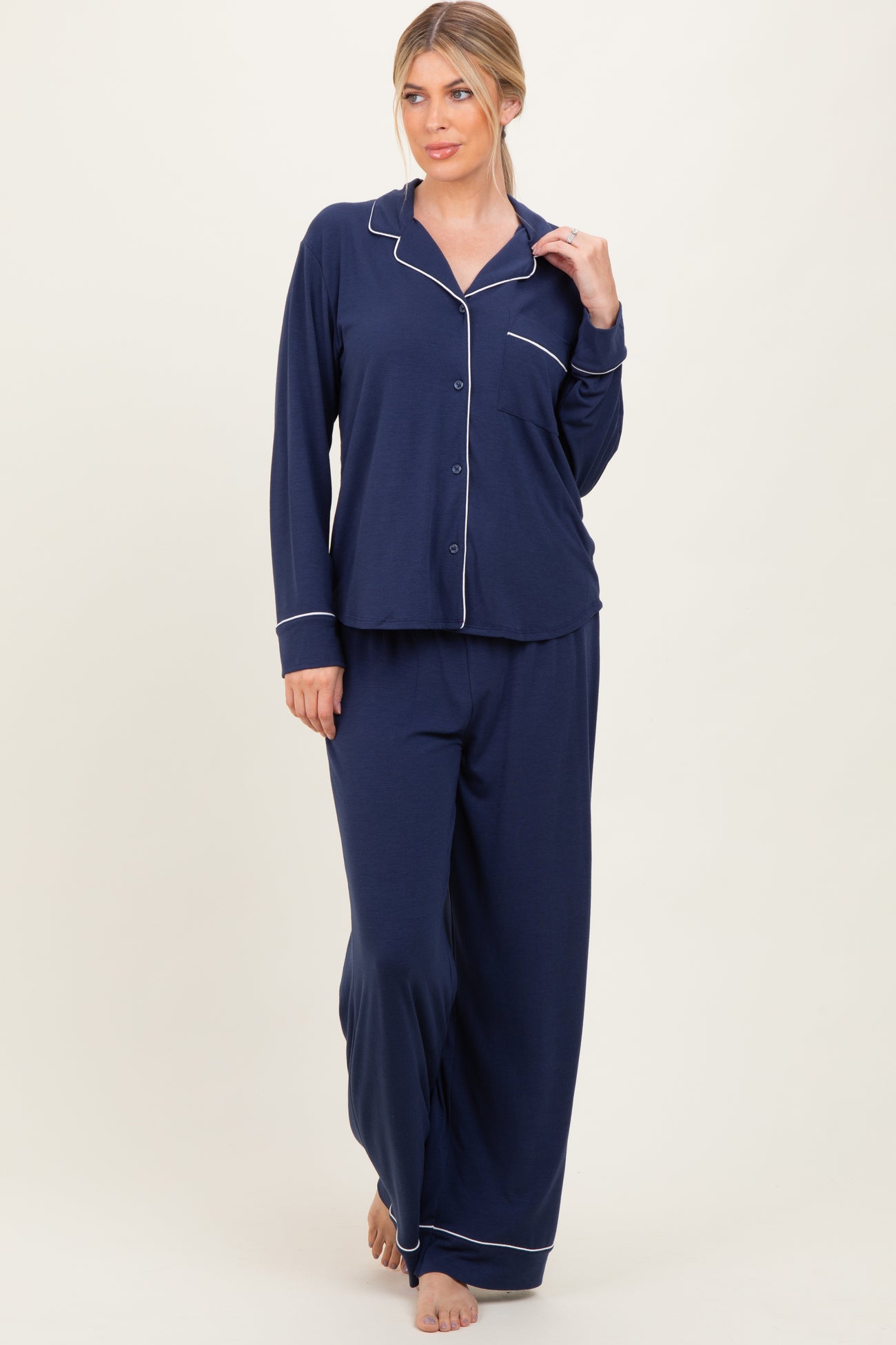 Dark Navy Button Down Top Wide Leg Pant Maternity Pajama Set
