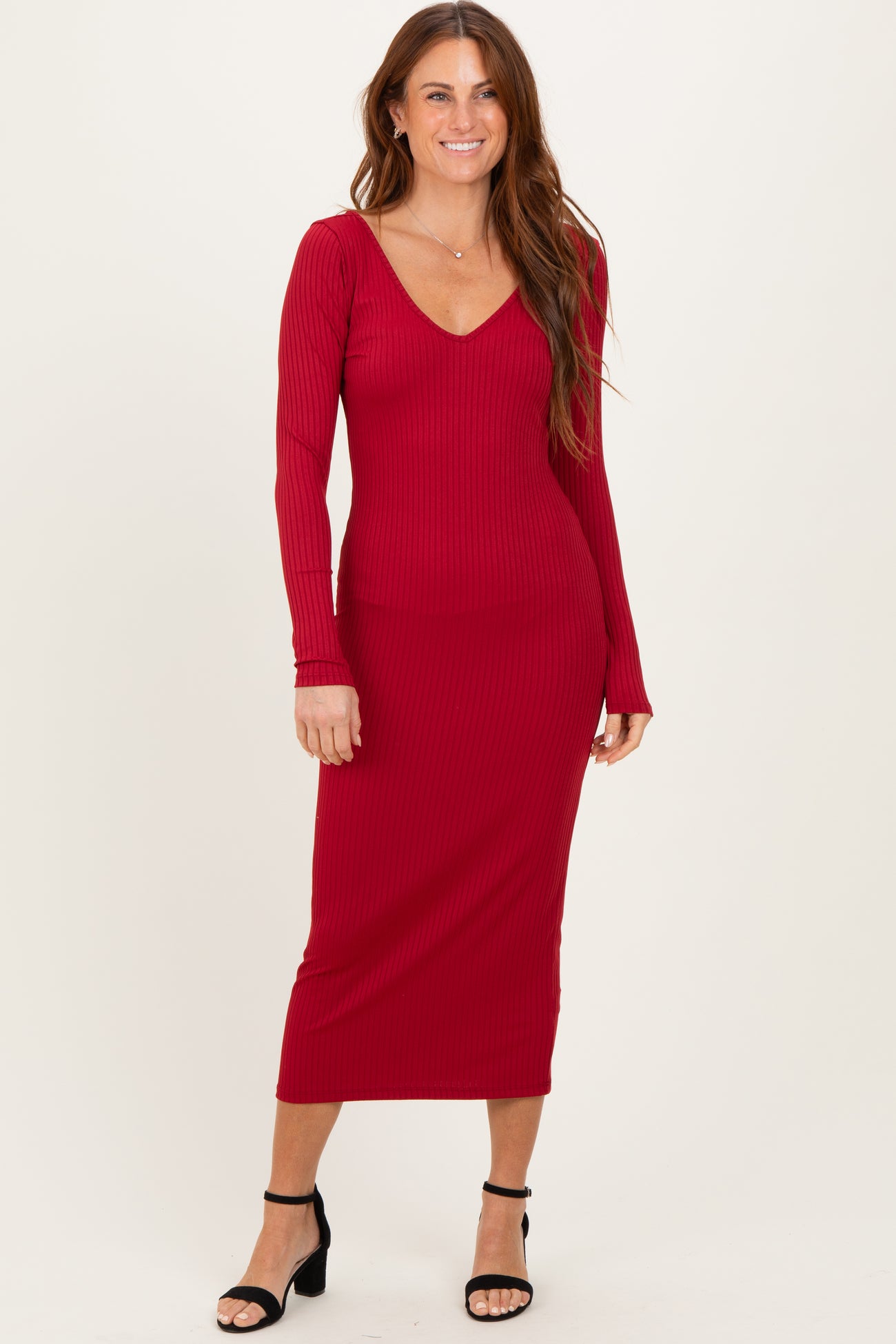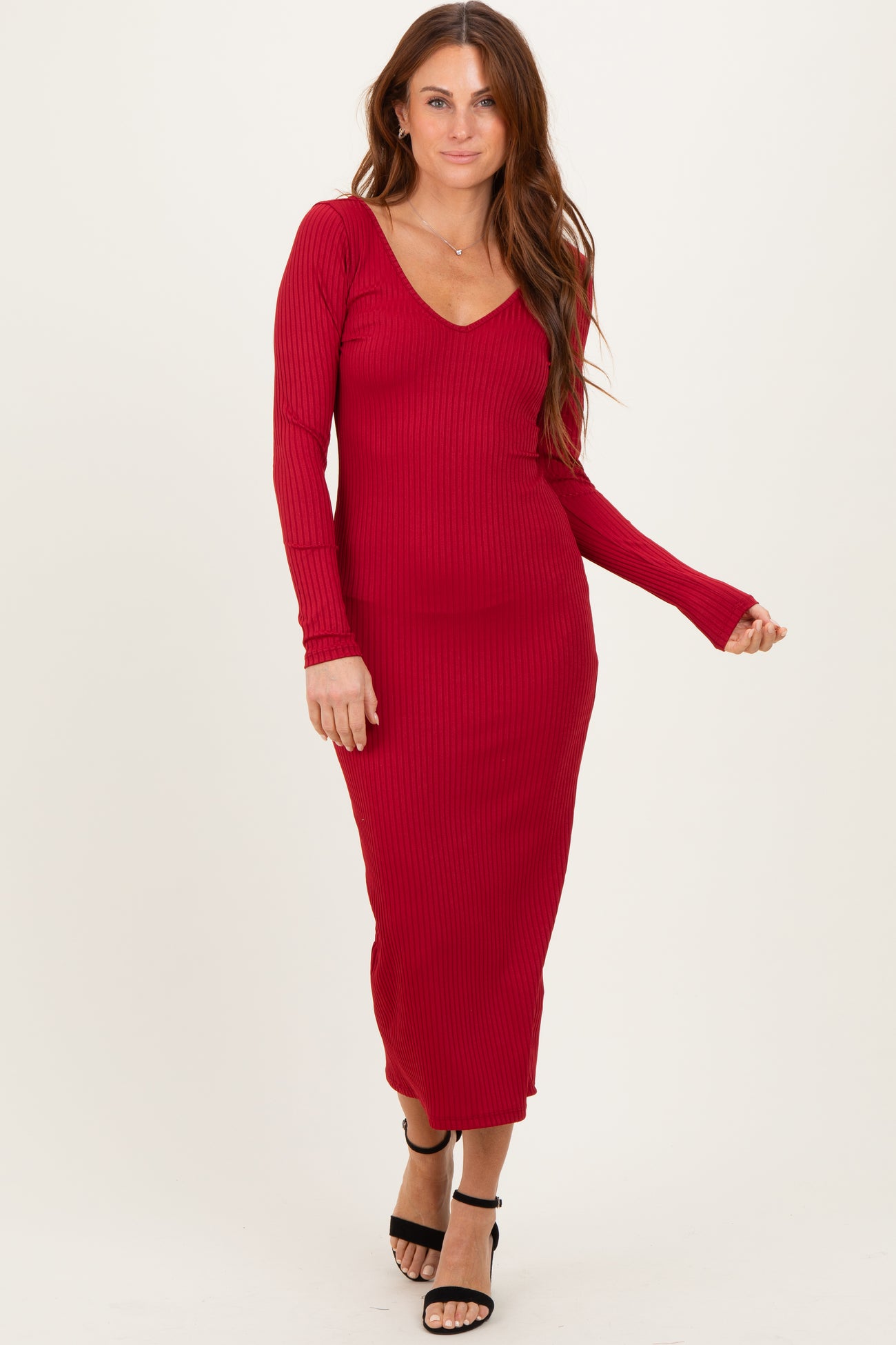 Dark Red V-Neck Long Sleeve Fitted Maxi Dress