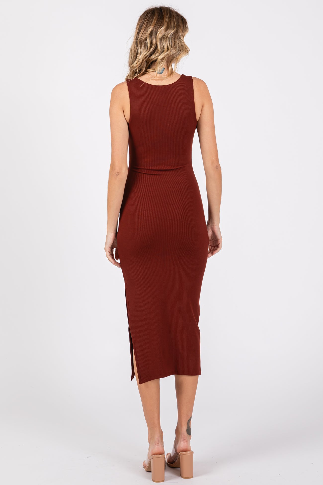 Dark Rust Ribbed Knit Sleeveless Side Slit Dress