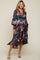A floral satin maternity midi dress featuring a v-neckline, a wrap waist tie, long smocked accent sleeves, and an asymmetrical skirt with a flounce trim.