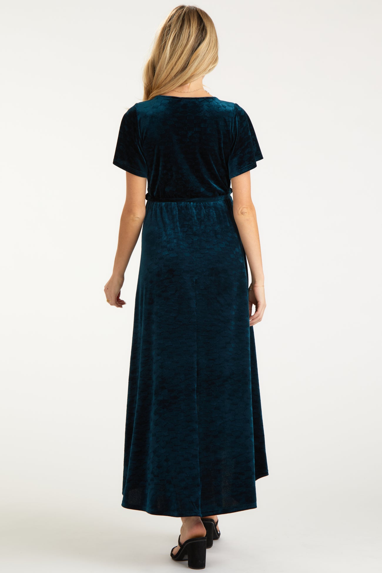 Details A velvet knit maternity midi dress featuring a wrap front v-neckline, short sleeves, an adjustable tie at the waist and a hi-low hem. Content + Care