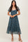 Deep Teal Floral Lace Overlay Puff Sleeve Midi Dress