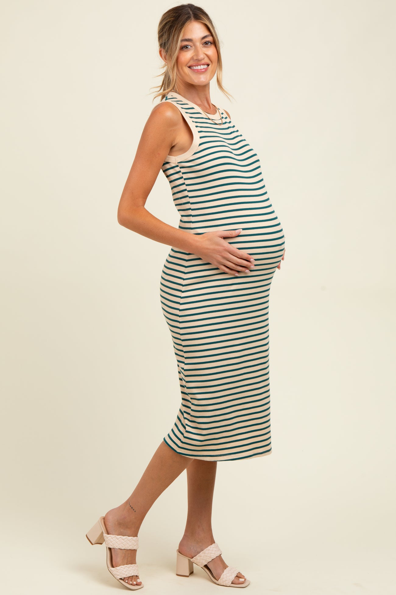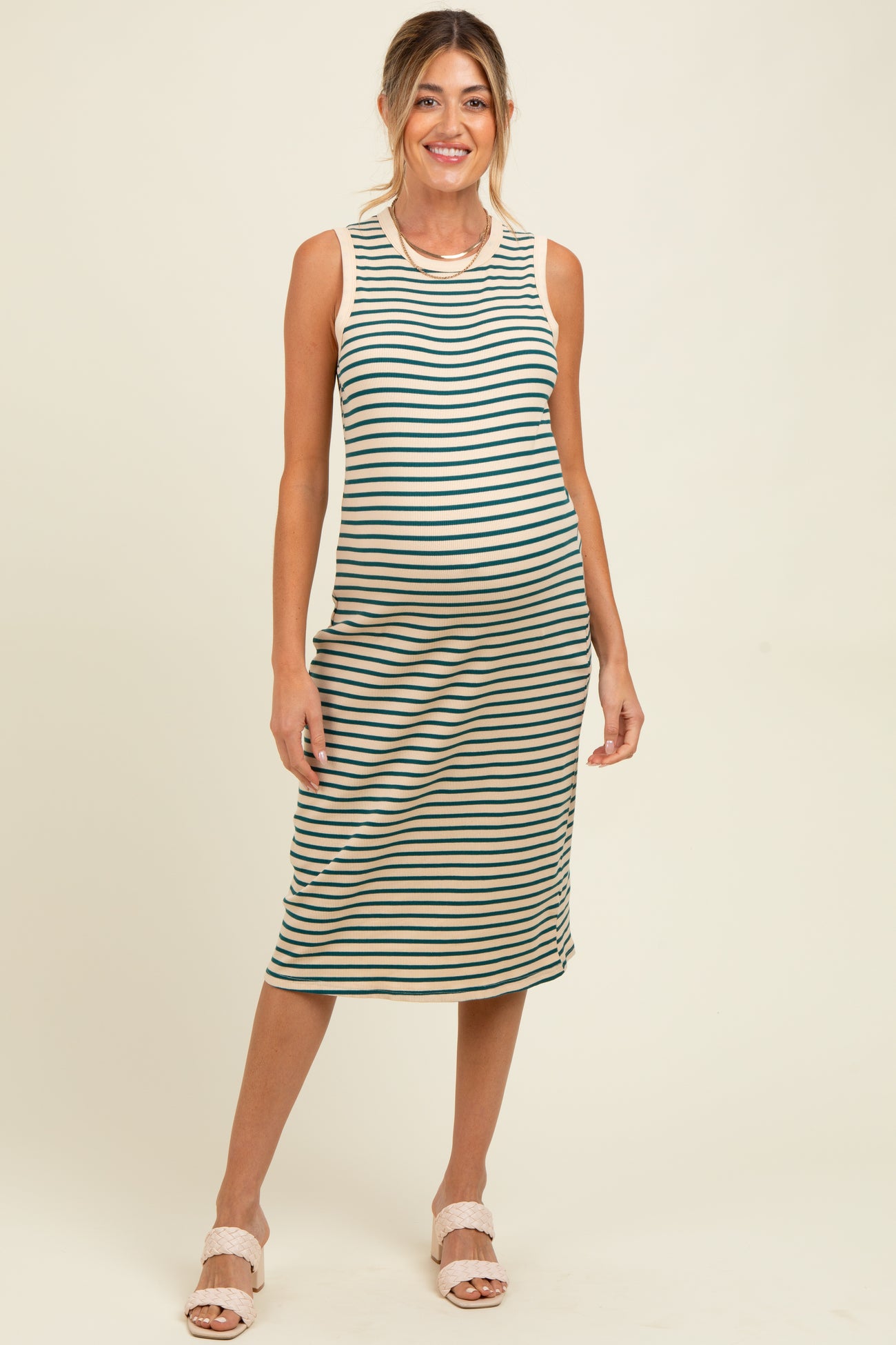 Enjoy effortless style and comfort with our Deep Teal Striped Ribbed Knit Sleeveless Maternity Midi Dress. Crafted from a soft, stretchy ribbed knit fabric, this dress gently hugs your mom-to-be curves while providing all-day comfort. The deep teal stripes add a fresh, modern touch, making it perfect for casual outings or relaxed weekends. Designed with a flattering midi length and sleeveless cut, it keeps you cool as your bump grows. Pair it with sandals or sneakers for a chic, easy maternity look that transitions seamlessly from season to season. Your new go-to dress for comfort and style!