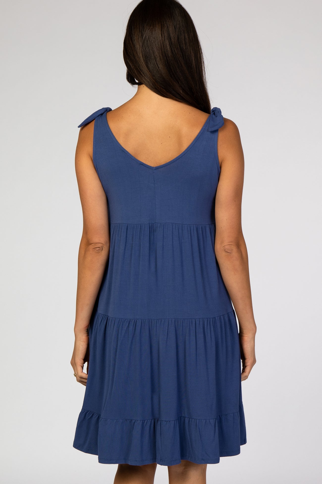 Details A solid hued dress featuring knotted straps, a tiered silhouette and a slight v-neck. Content + Care