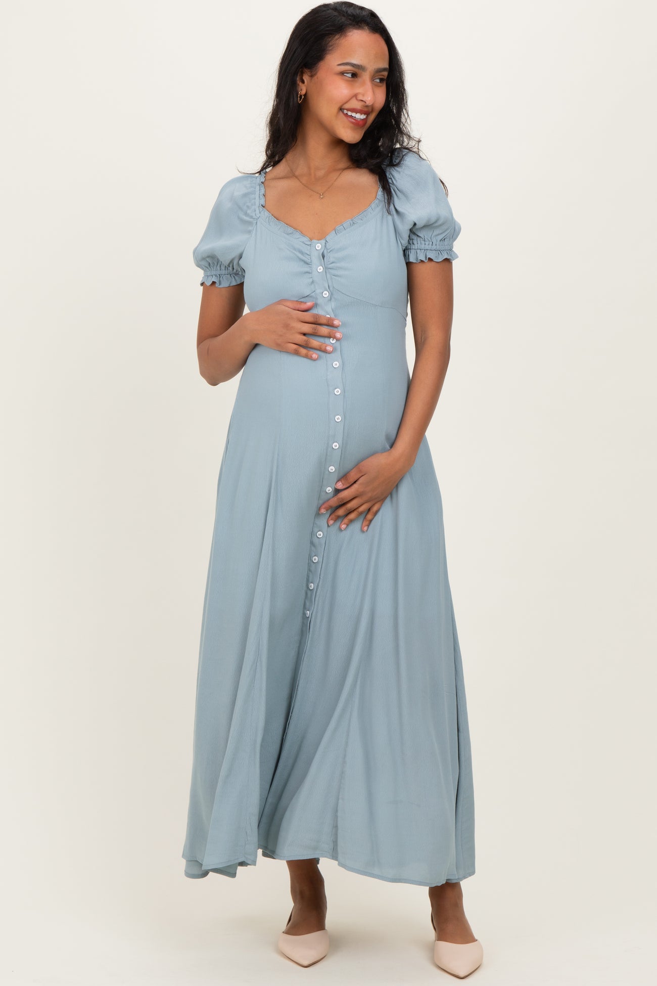Dusty Blue Button Down Ruffle Trim Maternity Maxi Dress